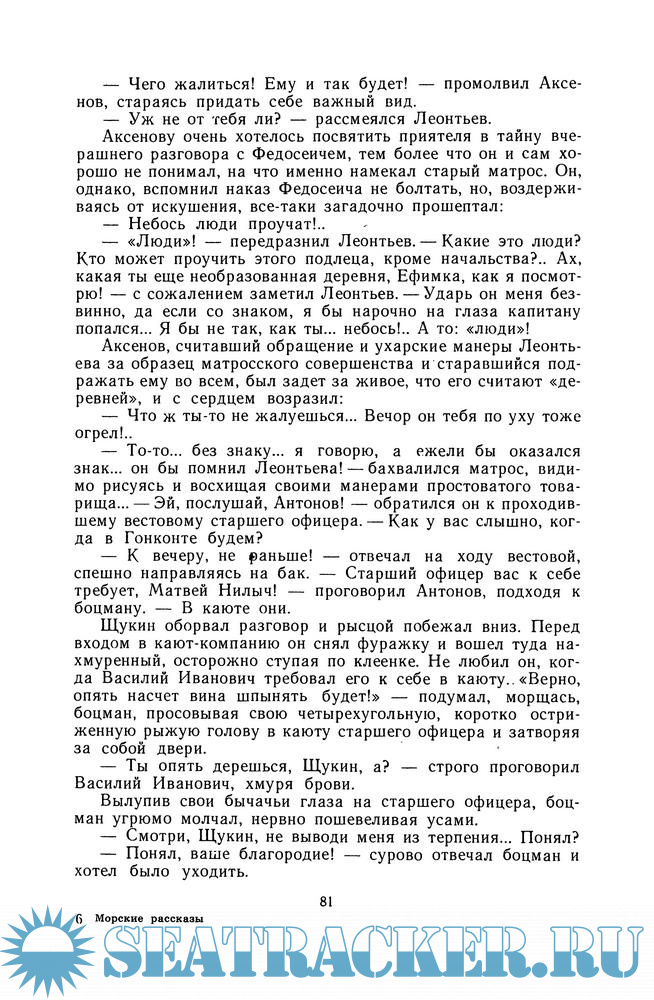 Описание: Главное, что привлекает нас в рассказах Станюковича — это изображение людей моря и прежде всего неутомимых тружеников — матросов. Писатель правдив во всем. Герои его рассказов кажутся срисованными с натуры, взятыми непосредственно из действительности, такими, как они есть: с просмоленными руками, обветренными и загорелыми лицами, житейской сметливостью, способностью на, самоотверженный подвиг, смелостью, стойкостью, терпением. В то же время это люди с затаенной в душе глубокой ненавистью к рабству и высоким, ничем не побеждаемым человеческим достоинством.
