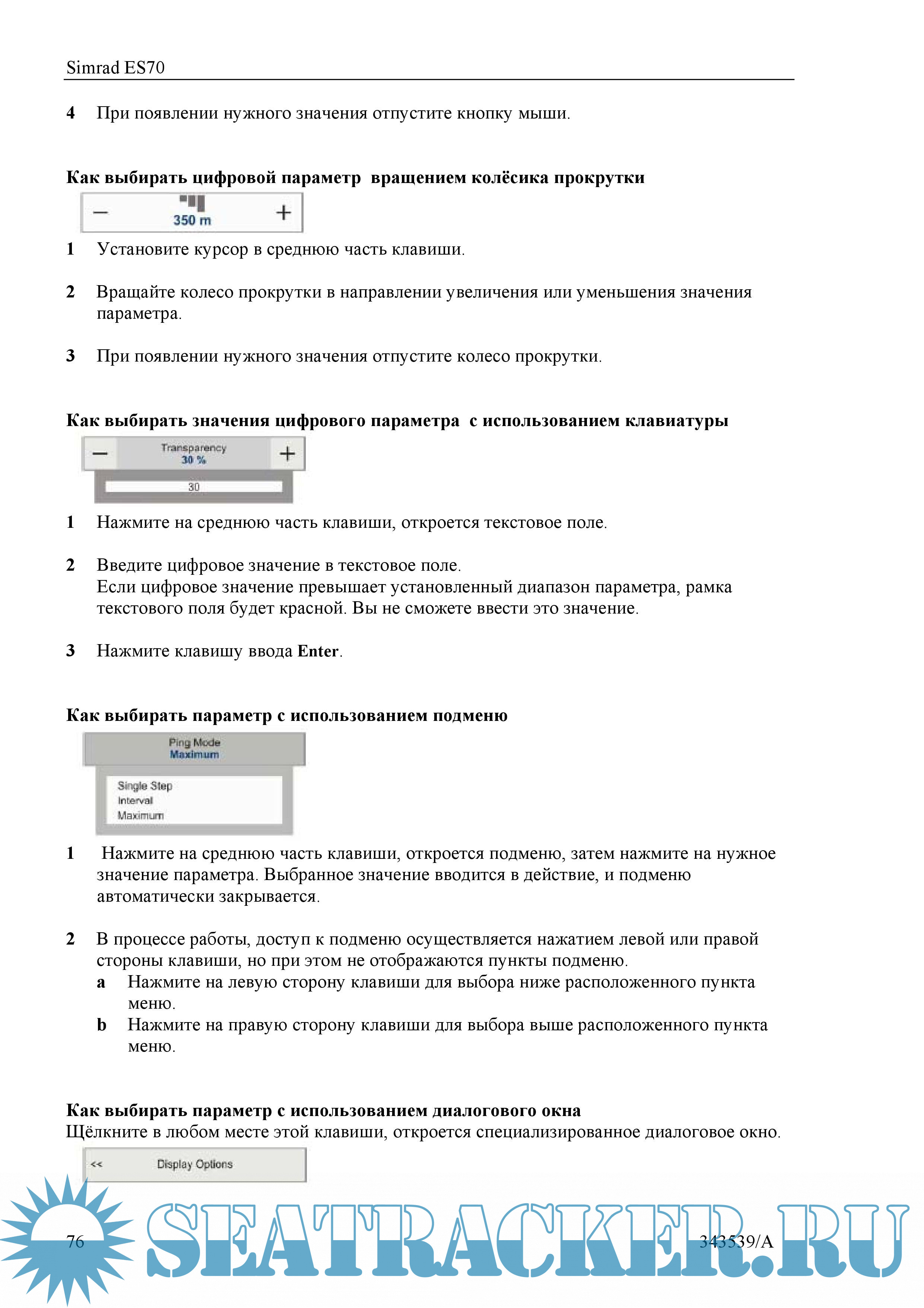 Общий обзор системы............................................................................................................10 Основные сведения.............................................................................................................10 Основные блоки..................................................................................................................10 Упрощённые схемы системы.............................................................................................12 Начало работы.............................................................................................................................13 Процедуры включения/выключения.....................................................................................13 Использование трекбола........................................................................................................15 Начало обычной работы.........................................................................................................15 Выбор рабочего режима.....................................................................................................16 Проверка установок трансивера и антенны.....................................................................16 Выбор установок обнаружения грунта.............................................................................17 Выбор установок цветовой шкалы....................................................................................17 Выбор установок распределения рыбы по размерам и расположения рыбы...............18 Выбор установок эхограммы.............................................................................................19 Выбор установок диапазона..............................................................................................21 Представление эхограмм.......................................................................................................22 Строка заголовка.....................................................................................................................23 Панель задач............................................................................................................................24 Система меню.........................................................................................................................24 Структура меню..................................................................................................................24 Клавиши меню....................................................................................................................25 Виды дисплея..............................................................................................................................28 Структура дисплея..................................................................................................................28 Строка заголовка.....................................................................................................................30 Логотип фирмы и наименование изделия........................................................................31 Операционные кнопки.......................................................................................................31 Обозначения информационных окон...............................................................................32 Навигационная информация..............................................................................................34 Функциональные кнопки...................................................................................................35 Строка воспроизведения........................................................................................................36 Главное меню..........................................................................................................................37 Эхограммы...............................................................................................................................37 Поверхностная эхограмма (Surface echogram).................................................................37 Донная эхограмма (Bottom echogram)..............................................................................38 Пелагическая эхограмма (Pelagic echogram)....................................................................39 Траловая эхограмма............................................................................................................40 Линии, маркеры и аннотации в эхограммах....................................................................40 Информационные окна...........................................................................................................43 Об информационных окнах...............................................................................................43 Информационное окно Depth (Глубина)..........................................................................44 Информационное окно Biomass (Биомасса)....................................................................44 Информационное окно Bottom Hardness (Твёрдость