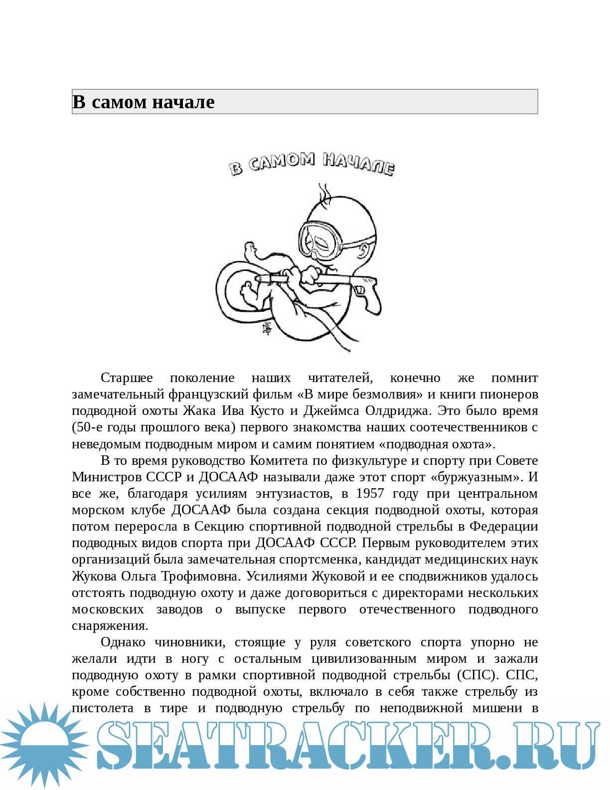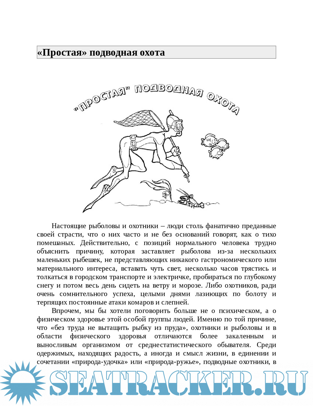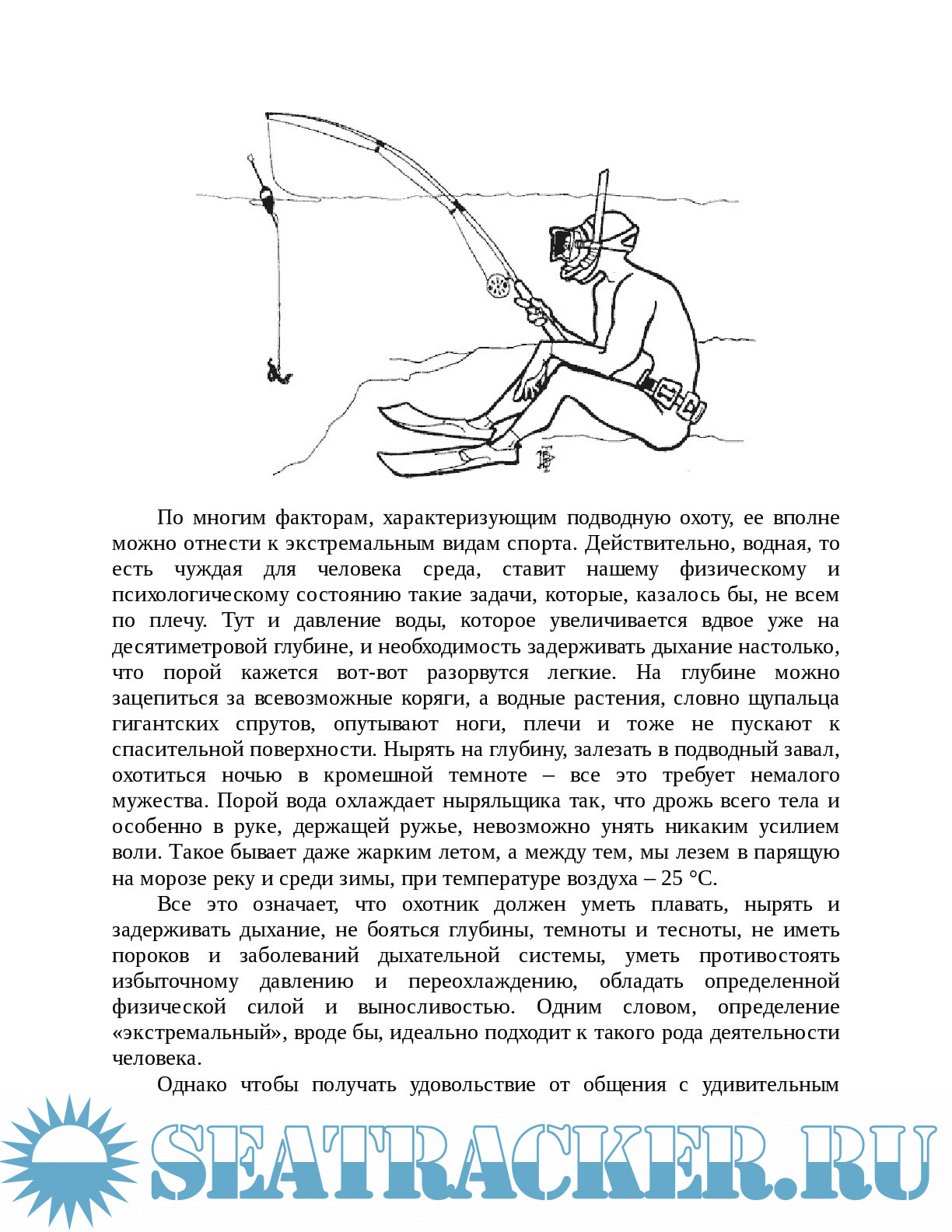 В. И. Виноградов К ЧИТАТЕЛЯМ Подводная охота по-русски В самом начале Река или море: вот в чем вопрос «Простая» подводная охота Ночная подводная охота Подводная охота зимой Уроки мастерства Охота в малых и горных реках Охота в больших реках Охота в озерах, карьерах и водохранилищах Наши вероятные противники Что еще полезно знать о владениях Нептуна Снаряжение: общие подходы и конкретные требования Права и обязанности каждого охотника Меры безопасности на подводной охоте Из рук в руки 1. Зачем нужно плавающее ружье и как этого добиться 2. Какого цвета ваше ружье 3. Как повысить КПД пневматического ружья 4. Модернизация магазинных ружей 5. Какой линь ставить на ружье 6. Малая модернизация магазинных одинарных наконечников 7. Как снизить подбрасывающий эффект у пневматического ружья 8. Как бороться с наклепами на поршне, стреле и скользящей втулке 9. Как усилить стрелу пневматического ружья с передним зацепом 10. Как заделывать концы гарпун-линя 11. Как обойтись без катушки 12. Клапан или простая затычка, на стравливающем соске сухого гидрокостюма 13. Как на «коленке» сделать верхний клапан на трубку 14. Как сделать хороший зимний многозуб 15. Почему трезубец должен быть длинным, но не широким 16. Что такое «угревый, пневый» наконечник 17. Малая модернизация маски 18. Как правильно распределить грузы и куканы на поясе 19. «Сковородка» на спине: плюсы и минусы 20. Почему линесбрасыватель такой, а не иначе 21. Можно ли ласты сделать более мягкими или более жесткими 22. Как увеличить калошу ваших ласт 23. Еще одна модернизация ласт с открытой пяткой 24. Что делать, если ласты бьют по воде 25. Если стрела вонзилась в бревно 26. Как изготовить сплавной мешок 27. Из чего должен состоять ЗИП и где его хранить 28. Если нет ЗИПа 29. Нужно ли ТО вашему снаряжению 30. Как днем не заблудиться в зарослях тростника и не потеряться на ночной охоте 1. 31. Как не замерзнуть на зимней охоте 32. Если на дворе мороз, а на вас мокрый гидрокостюм 33. Надо ли целиться в рыбу 34. Куда стрелять рыбу 35. Как поднимать добычу после выстрела 36. Как снимать рыбу со стрелы 37. Какую рыбу и как сажать на кукан 38. Как обезопасить уши от простуды и инфекции 39. Как облегчить влезание в гидрокостюм 40. Как продлить жизнь вашему гидрокостюму 41. Как заклеить гидрокостюм 42. Как хранить гидрокостюм 43. Как правильно говорить с рыбинспектором 44. Тотальное невезение и как с этим бороться 45. Что делать, если нельзя, но очень хочется 46. Одна машина, два охотника и вечный сплав 47. Возможности весенней охоты 48. Куда девать усы и бороду 49. Наземная экипировка подводного охотника 50. Еще один способ сохранить рыбу Используемая литература: notes