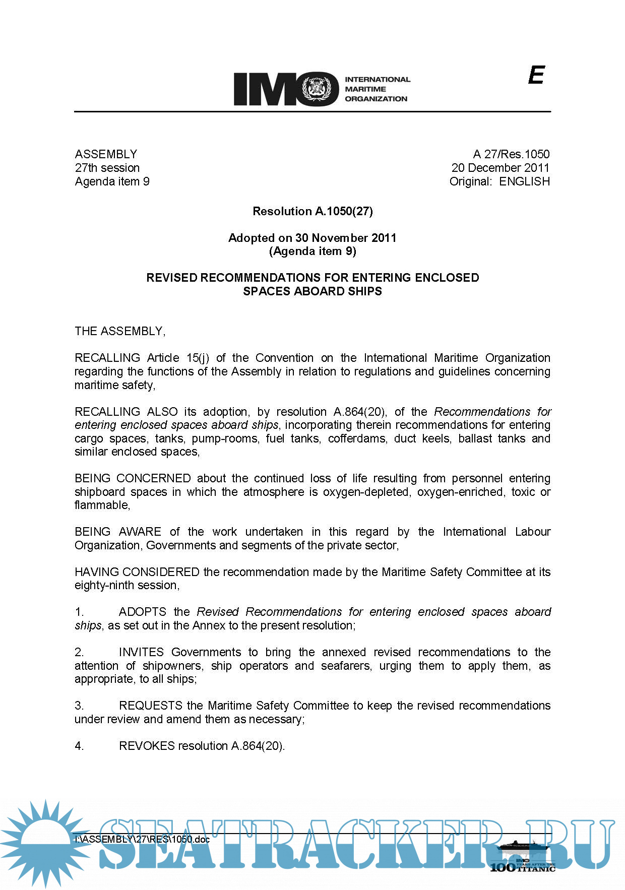 2. Assembly Resolution A.1050(27) (Revised Recommendations for Entering Enclosed Spaces Aboard Ships); (13 Pages)