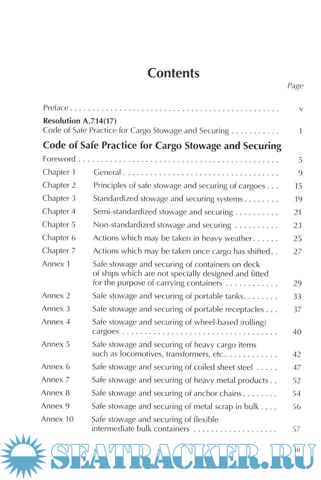Year: 2018 Language: english Author: IMO Genre: Convention (rules) Publisher: CPI Books Limited Edition: Third edition 2011 with corrections up to 04.2018 ISBN: 978-92-801-1536-9 Format: PDF Quality: Scanned pages Pages count: 150 Description: The 2011 edition of the Code of Safe Practice for Cargo Stowage and Securing (CSS Code) incorporates all amendments up to and including 2010. Guidance on providing safe working conditions for securing of containers on deck. Book is corrected with Errata Oct.2011 and Supplement 04.2018. Additional info: Interactive menu was added for easy navigation. Book was corrected with Errata Oct.2011 and Supplement 04.2018.