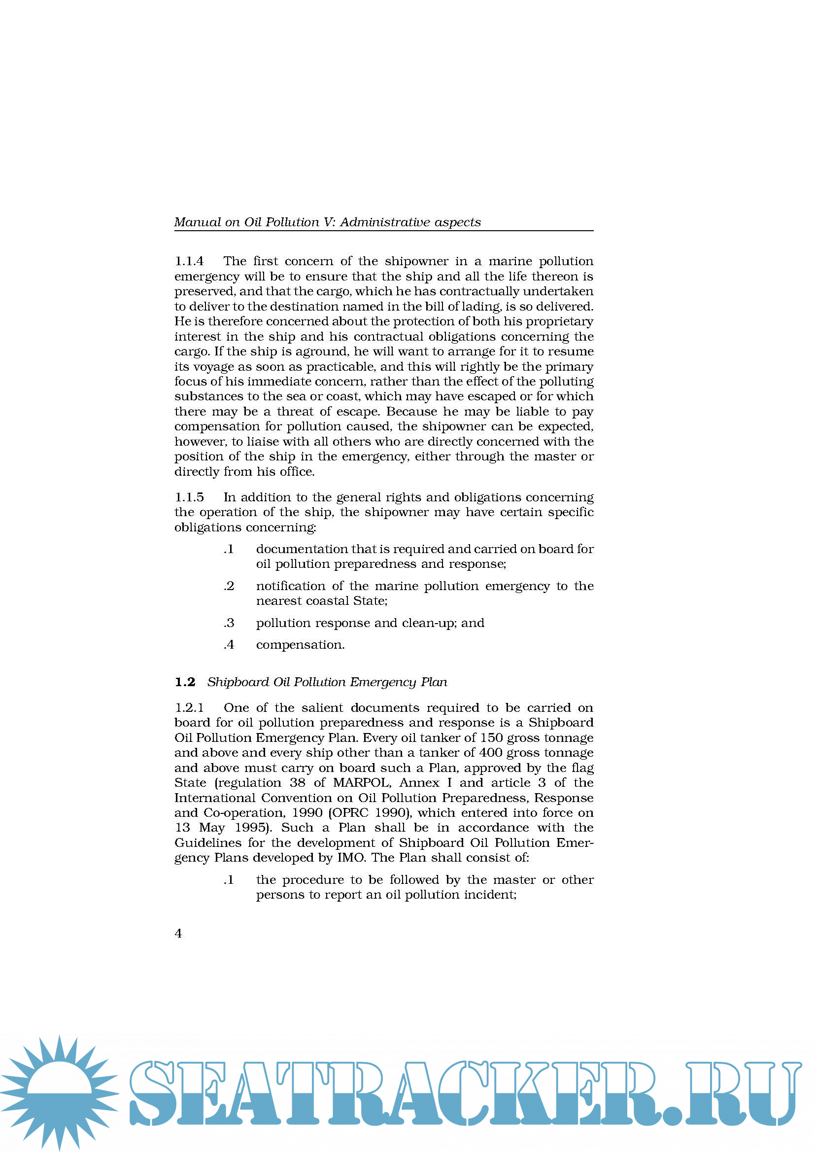 Year: 2009 Language: english Author: IMO Genre: Manual Publisher: CPI Group Edition: Second ISBN: 978-92-801-1500-0 Format: PDF Quality: eBook Pages count: 108 Description: This section provides the reader, in particular on-scene commanders, lead agencies and others involved in the management of oil pollution response, with an appreciation of the various interests involved in an oil pollution emergency and its aftermath, as well as a general review of the international legal regimes governing limitation of liability and compensation for oil pollution damage.