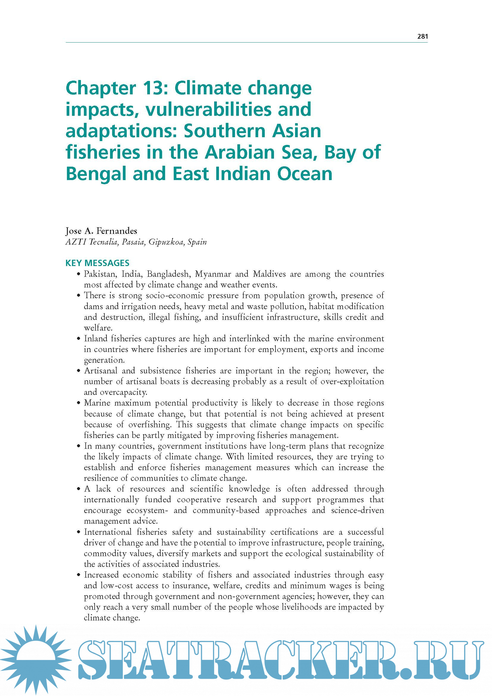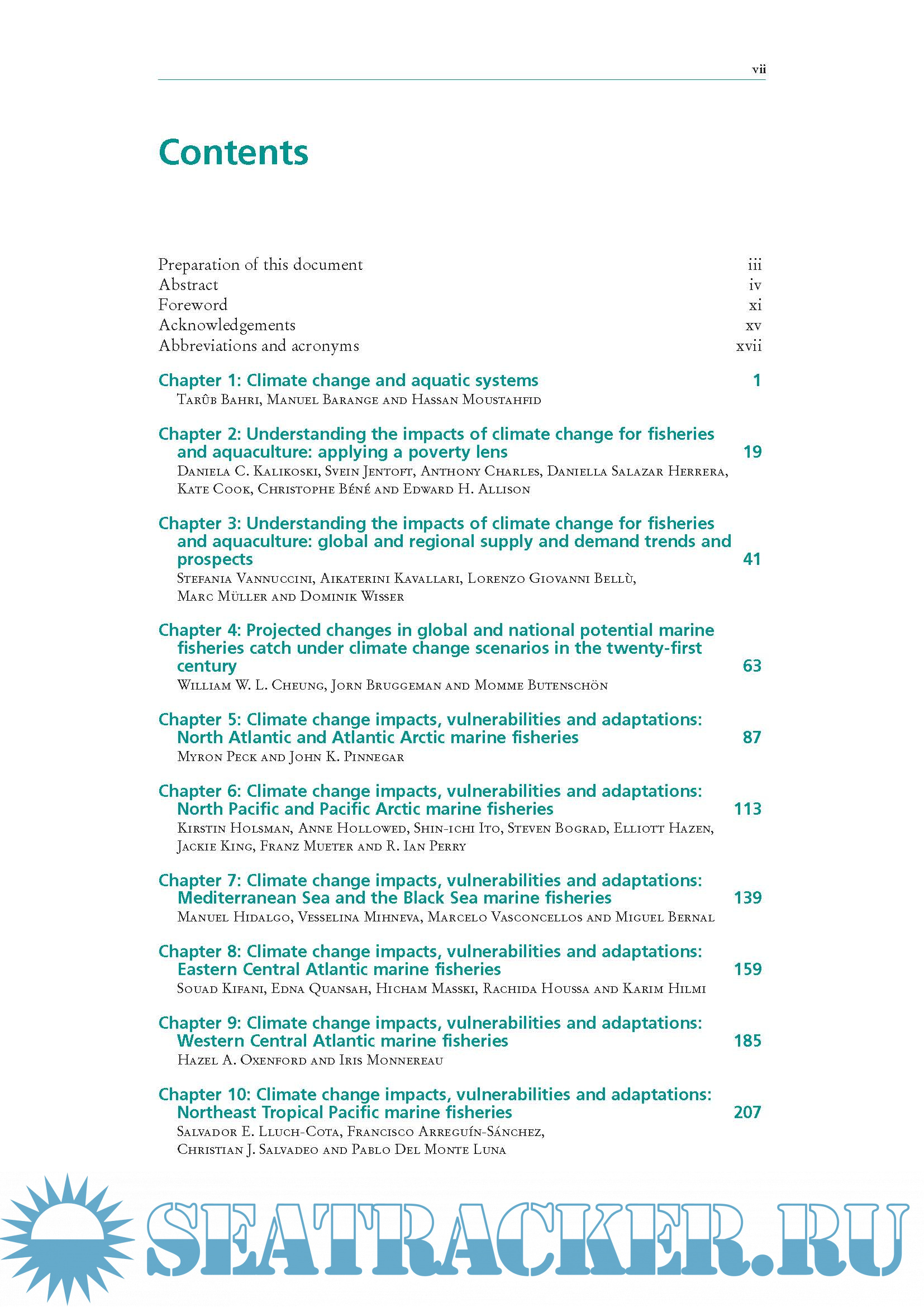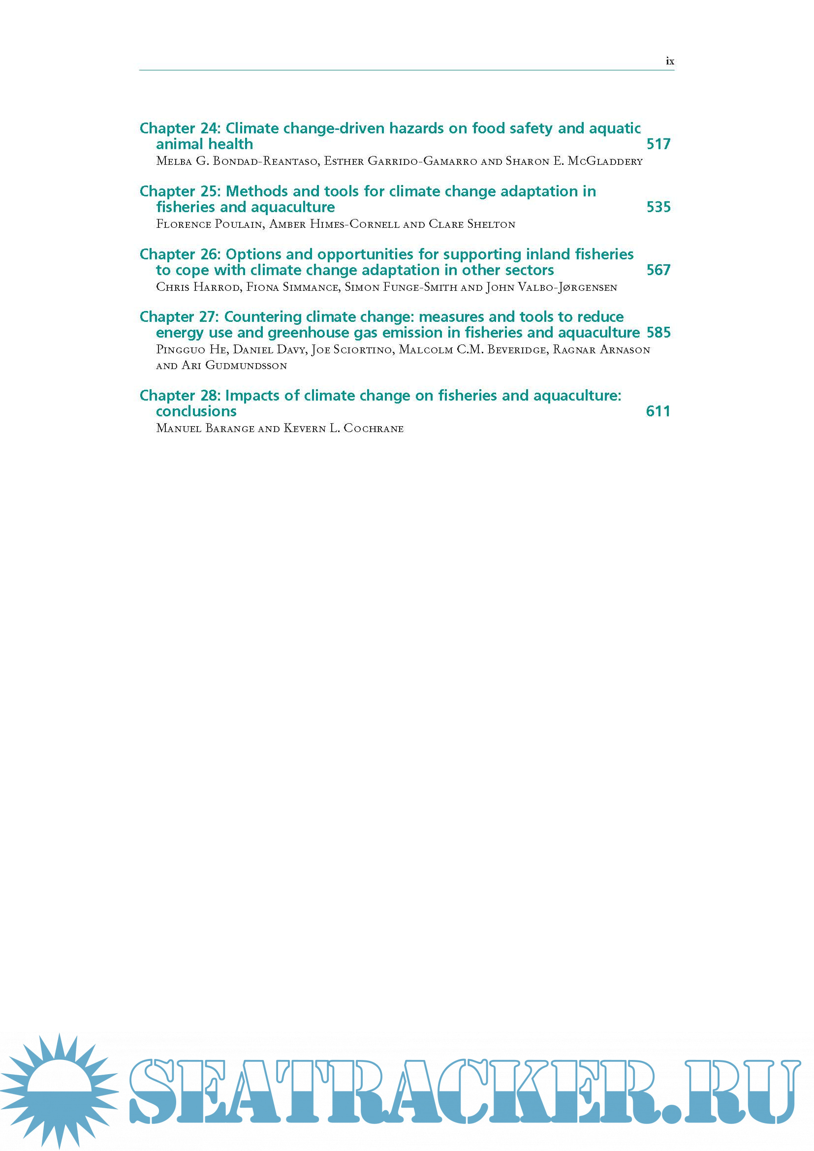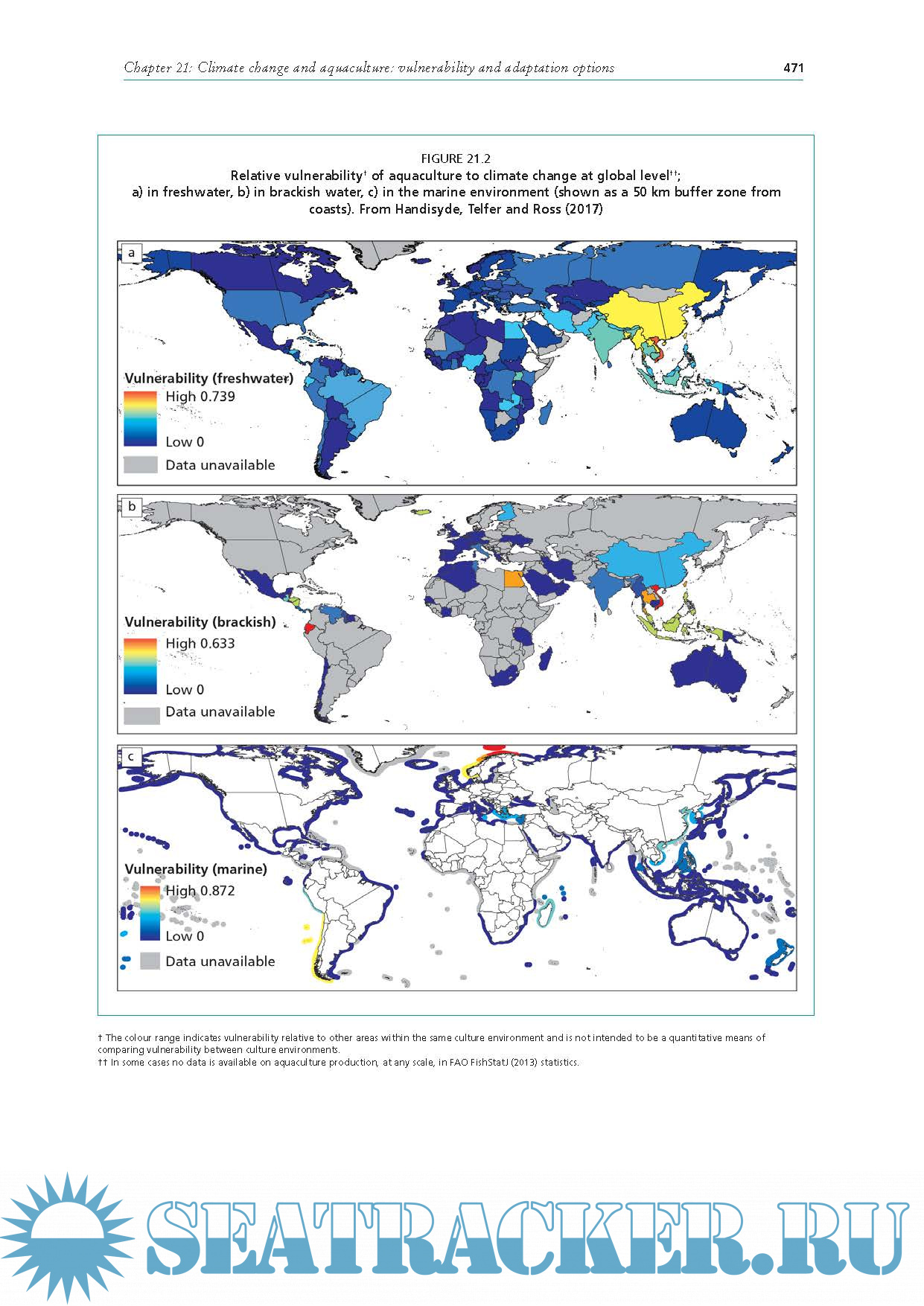 Year: 2018 Language: english Author: FOOD AND AGRICULTURE ORGANIZATION OF THE UNITED NATIONS Genre: Technical book Format: PDF Quality: eBook Pages count: 654 Description: The 2015 Paris Climate Agreement recognizes the need for effective and progressive responses to the urgent threat of climate change, through mitigation and adaptation measures, while taking into account the particular vulnerabilities of food production systems. The inclusion of adaptation measures in the fisheries and aquaculture sector is currently hampered by a widespread lack of targeted analyses of the sector’s vulnerabilities to climate change and associated risks, as well as the opportunities and responses available. This report provides the most up-to-date information on the disaggregated impacts of climate change for marine and inland fisheries, and aquaculture, in the context of poverty alleviation and the differential dependency of countries on fish and fishery resources. The work is based on model projections, data analyses, as well as national, regional and basin-scale expert assessments. The results indicate that climate change will lead to significant changes in the availability and trade of fish products, with potentially important geopolitical and economic consequences, especially for those countries most dependent on the sector.