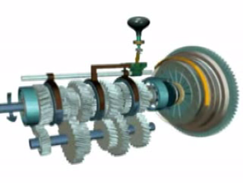 На видеоролике показана работа классической механической коробки переключения передач с узлом сцепления и двухвальной конструкцией.