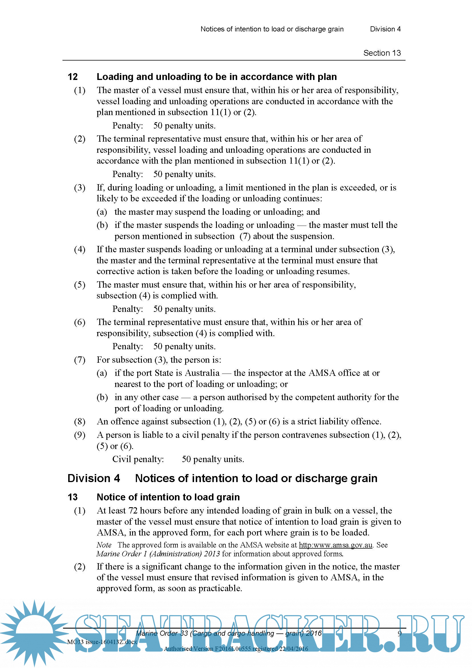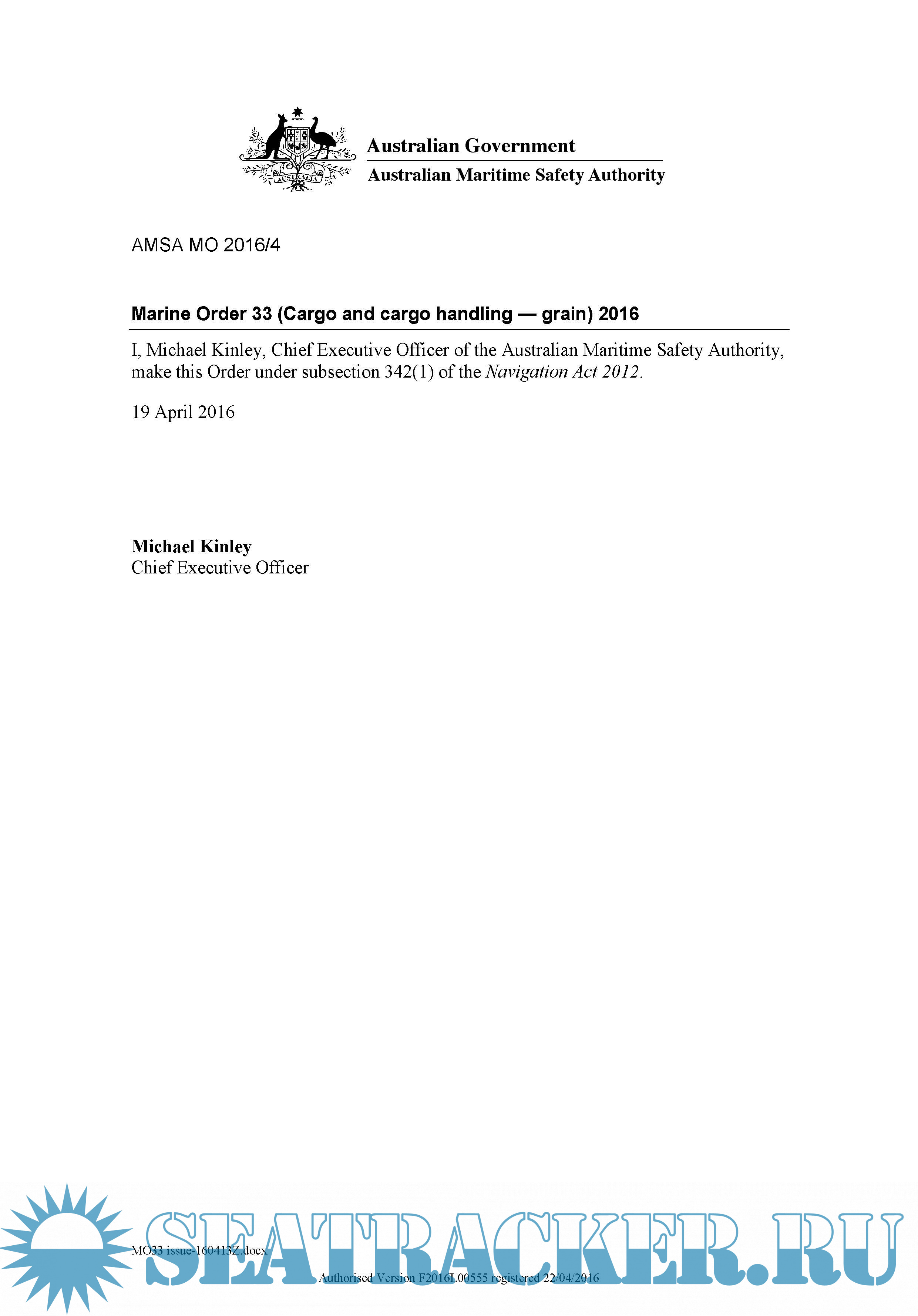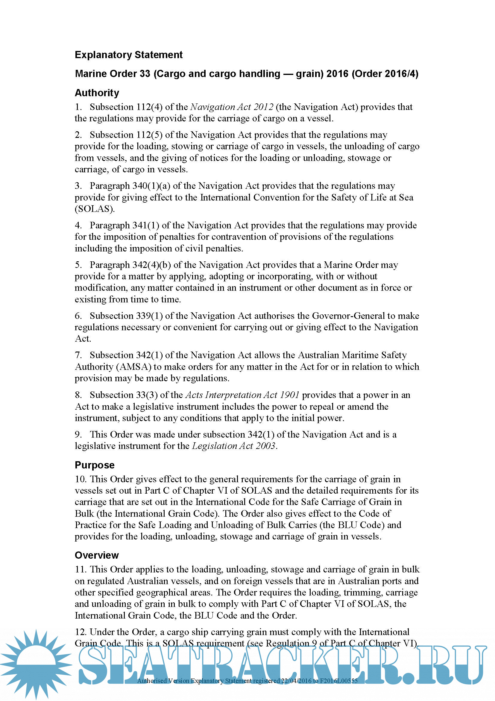 Marine Order 33 (Cargo and cargo handling - Grain), Explanatory Statement & Calculation of Stability for Ships Carrying Bulk Grain updated to 2018