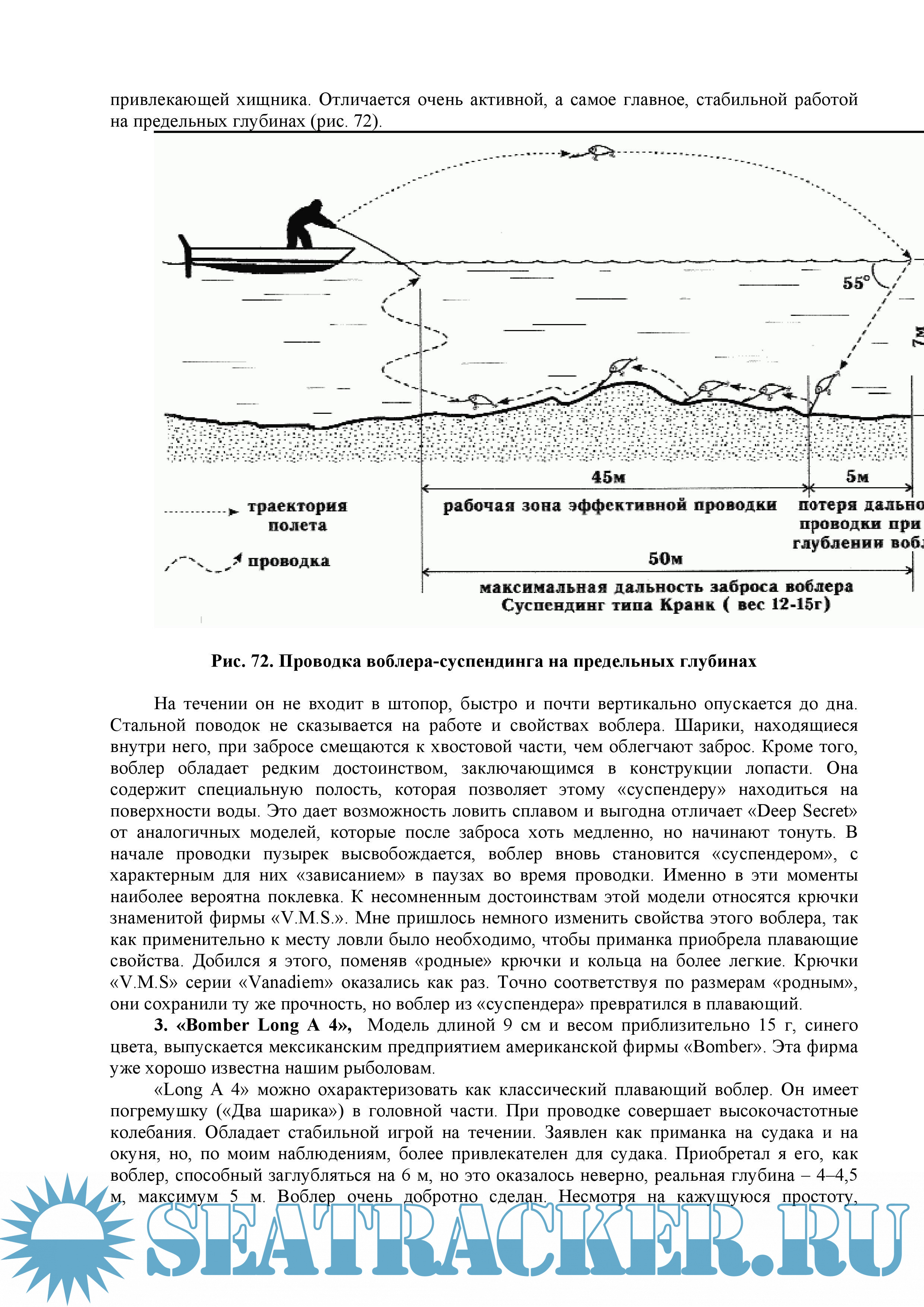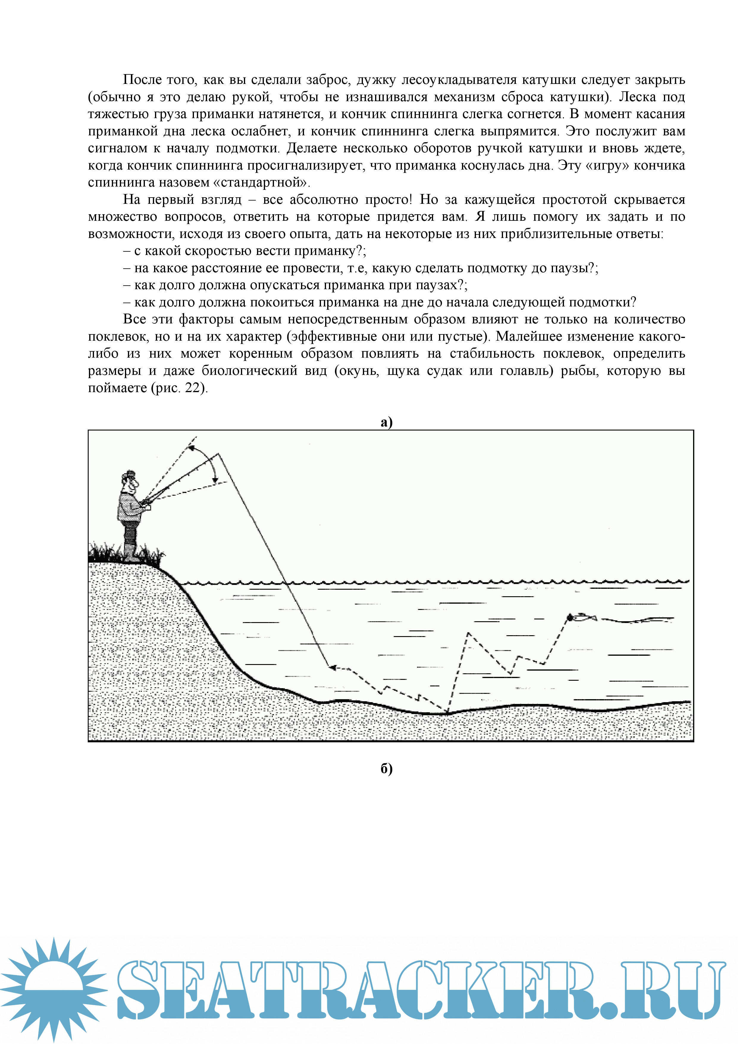 Часть 1:Спиннинг: принадлежности и аксессуары Выбор спиннинга Об идеальном (сложном или комбинированном) строе Безынерционные катушки Первая помощь вашей катушке Поломки и ремонт: Монолески Плетенные лески («плетенки») Мультипликаторные катушки (мульты) Профилактика «мультов» Смазка Причины нестабильной работы Кольца Визуальный выбор спиннинга Самостоятельный ремонт спиннингового удилища Маленькие хитрости Часть 2 Ловля в малых и средних реках, старицах и озерах Общие рекомендации Экипировка и снаряжение Поиск судаковых стоянок в реках без эхолота Ступенчатая проводка в реках Поклевка Статистика поклевок Необходимый минимум для ловли ступенчатой проводкой с лодки О якорении Преподнесение приманки капризной щуке Вращающиеся блесны Колеблющиеся блесны Воблеры Спиннеры Ловля жереха Поклевка Преподнесение приманки Ловля в характерных («аномальных») местах Ловля вдогонку Ловля на «бой», «удар», «всплеск» или «потяжку» Ловля на волну Ловля язя Ловля окуня Часть 3 Ловля нетрадиционных хищных рыб семейства карповые Ловля сазана, карпа, карася Ловля чехони Ловля красноперки Ловля плотвы, подуста, ельца Часть 4 Практика ловли хищной рыбы на мягкие приманки Наша старая знакомая поролоновая «рыбка» (классика поролона) Причины уловистости Поролоновая «рыбка» –русский подход к деликатной теме Некоторые особенности изготовления «рыбок» Форма и содержание О раскраске «рыбок» Выбор места ловли «Рыбки» с противозацепным устройством Составная (незацепляющаяся) поролоновая «рыбка» Противозацепное устройство для ловли в «глухом», «непроходимом» коряжнике Рыбки-имитации для ловли щуки Груз –эксцентрик Приманки из силикона Практика ловли Ловля в реках на «поролонку» Ловля в стоячей воде на силиконовые приманки Ловля в реках на силиконовые приманки Примеры из практики В цивилизованных водоемах О разновидностях ступенчатой проводки Экипировочный минимум Часть 5 Ловля на воблеры «Воблерная» революция Воблер –нетипичная приманка (техника проводки) Классификация воблеров О качестве Техника заброса парусящих приманок (воблеров) Ловля с лодки Об уловистости Игра приманки Ловля судака Тактика ловли во время «боя» или в погоне за «крупняком» Конкретные приемы ловли Ловля в реках Выбор места Тактика ловли с лодки Тактика ловли с берега Приемы ночной ловли Техника ловли ночью Выбор снасти Ловля щуки О цвете приманки О нанесении светоносителей Приемы ловли Воблером со дна водоема В густой растительности заросших плесов Крупная щука берет на все, но есть и исключения… Ловля на глубоконыряющие воблеры Воблеры, джиговые приманки, «поролонки», что лучше и что эффективнее? Характеристики глубоконыряющих воблеров Снаряжение Последовательность ловли Как пользоваться отцепом Часть 6 Ловля на вращающиеся и колеблющиеся блесны О качестве и эффективности блесен Вращающиеся блесны Область применения Об универсальности Блесны для ловли на глубине, течении и при вялом клеве Многофункциональные блесны с грузилом-головкой Акустические блесны Подбор цветовой гаммы, раскраска лепестка и оперение блесен Универсальные спиннеры с пропеллером в носовой части Приемы ловли Блесенные тандемы Колеблющиеся блесны Многофункциональные «колебалки» Приемы ловли Объемно-составные и комбинированные приманки Параллельно-расположенные (мн