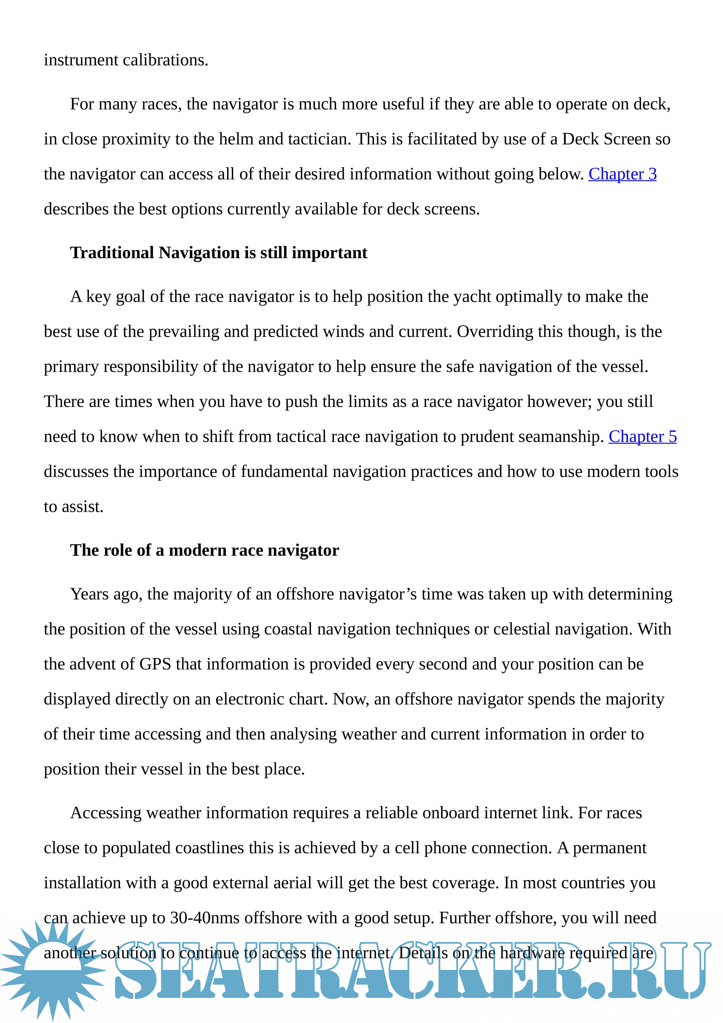 Information is provided on setting up a navigation station, deck screens, instrument calibration, accessing weather information, short course racing, starting, offshore routing, tracking the opposition, sail charts, and performance analysis. Web links are provided throughout the book to allow the reader to visit the relevant web sites as they read through the book. Recommended reading and key web sites are provided at the end of the book.