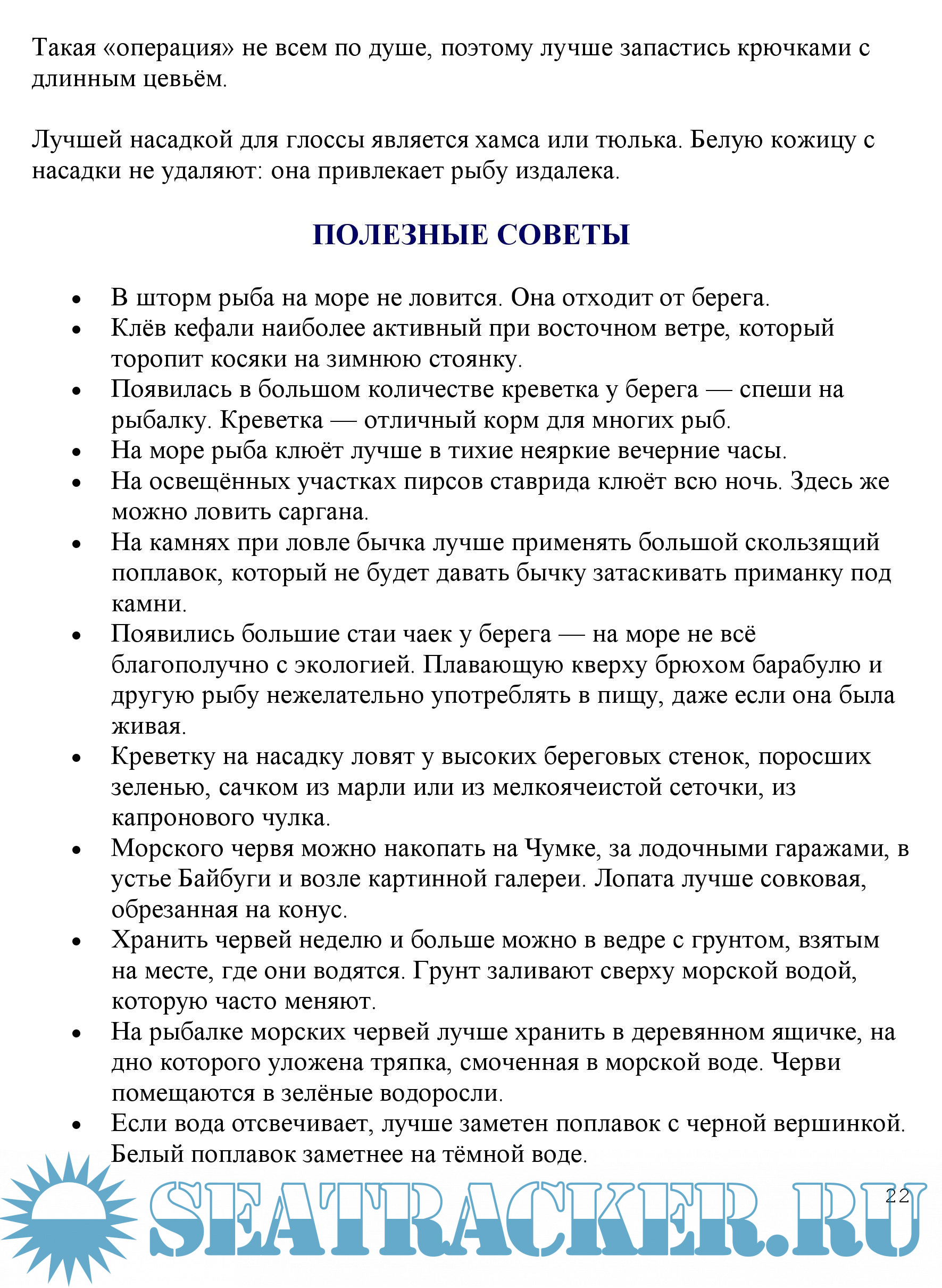 Морская рыбалка. Бычок - постоянный трофей рыболовов. Сарган - рыба-стрела. Ставрида - темноглазая красавица. Барабуля. Когда цветёт акация. Кефаль - заветная, как мечта. Черноморская акула - катран. Ловля акулы с берега. Зеленушка - рыба-радуга. Пикша - мелочь тоже рыба. Пеленгас - краснопёрая кефаль. Камбала глосса. Советы. В тиши приморских водоёмов. Серебряный карась. Окунь. Морская душа. Плотва. Серебряное ожерелье. Карп - неукротимый соперник. Судак. О чем судачат судаки? Щука с руку. Советы.