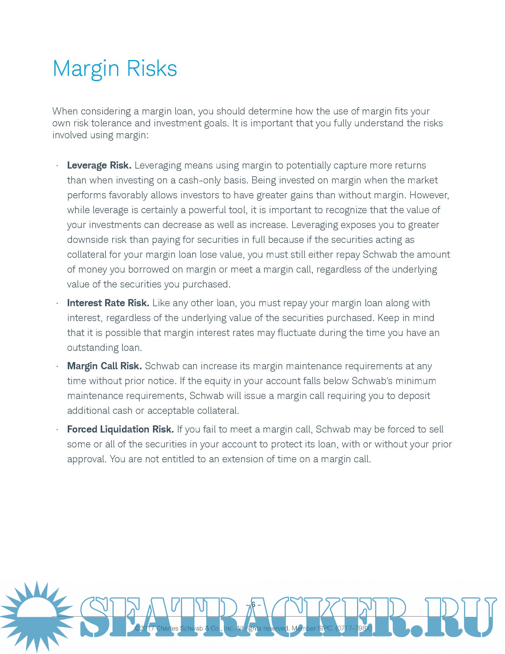 Year: 2017 Language: english Author: Charles Schwab & Co Genre: Guide Format: PDF Quality: eBook Pages count: 34 Description: Margin is an extension of credit from a brokerage company using your own securities as collateral. Funds borrowed on margin may be used for any purpose, including the purchase of securities. Interest is charged on the borrowed funds for the period of time that the loan is outstanding. The use of margin is regulated by financial industry regulatory organizations, certain securities exchanges, and the broker-dealer holding the account.