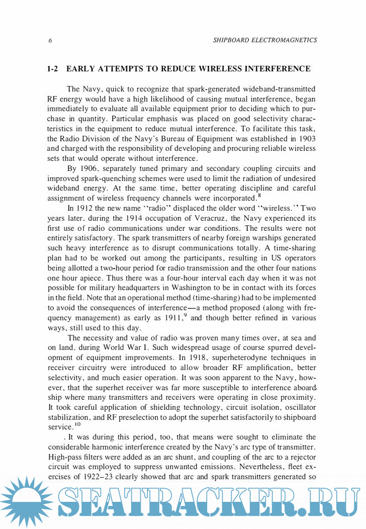 Year: 1987 Language: english Author: Law P.E. Publisher: Artech House ISBN: 0-89006-247-1 Format: PDF Quality: Scanned pages Pages count: 279 Description: Electromagnetics, in the special sense that we will be concerned with in this book, is the interaction of electric and magnetic fields associated with radiated energy - i.e., energy in the form of radiated electromagnetic fields. As such, the principal topic of interest here will be shipboard devices that emit or sense electromagnetic waves in the radio-frequency spectrum from extremely low frequencies through extremely high-frequency microwave. Other portions of the electromagnetic spectrum such as light waves (e. g. , infrared and fiber optics) will not be addressed in depth. This book endeavors to discuss each of the chief concerns of shipboard electromagnetics and to show how the problems of compatibility and interference are resolved. It is hoped that in this manner the book will provide much needed understanding and assistance to naval engineers working in ship systems design and operations.