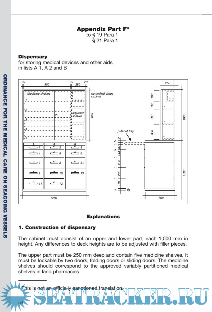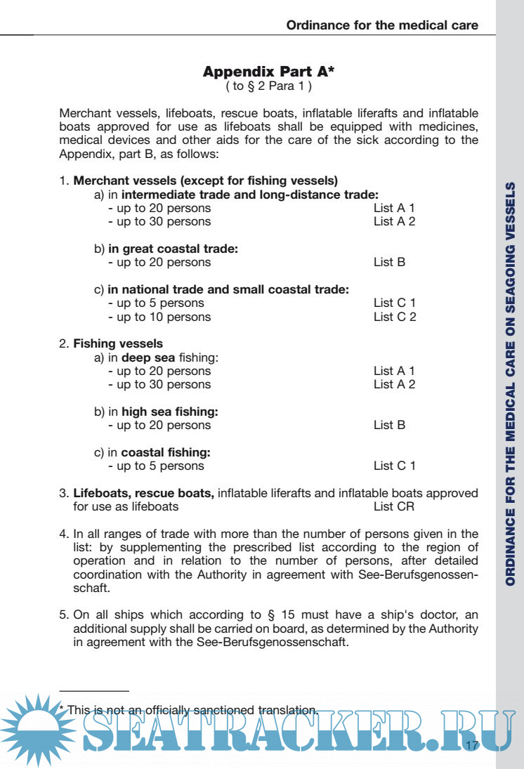 Description: Merchant vessels flying the German flag and their lifeboats, rescue boats, inflatable liferafts and inflatable boats approved for use as lifeboats shall be equipped with medicines, medical devices and other aids for the care of the sick in compliance with the regulations of this Ordinance and its appendices.