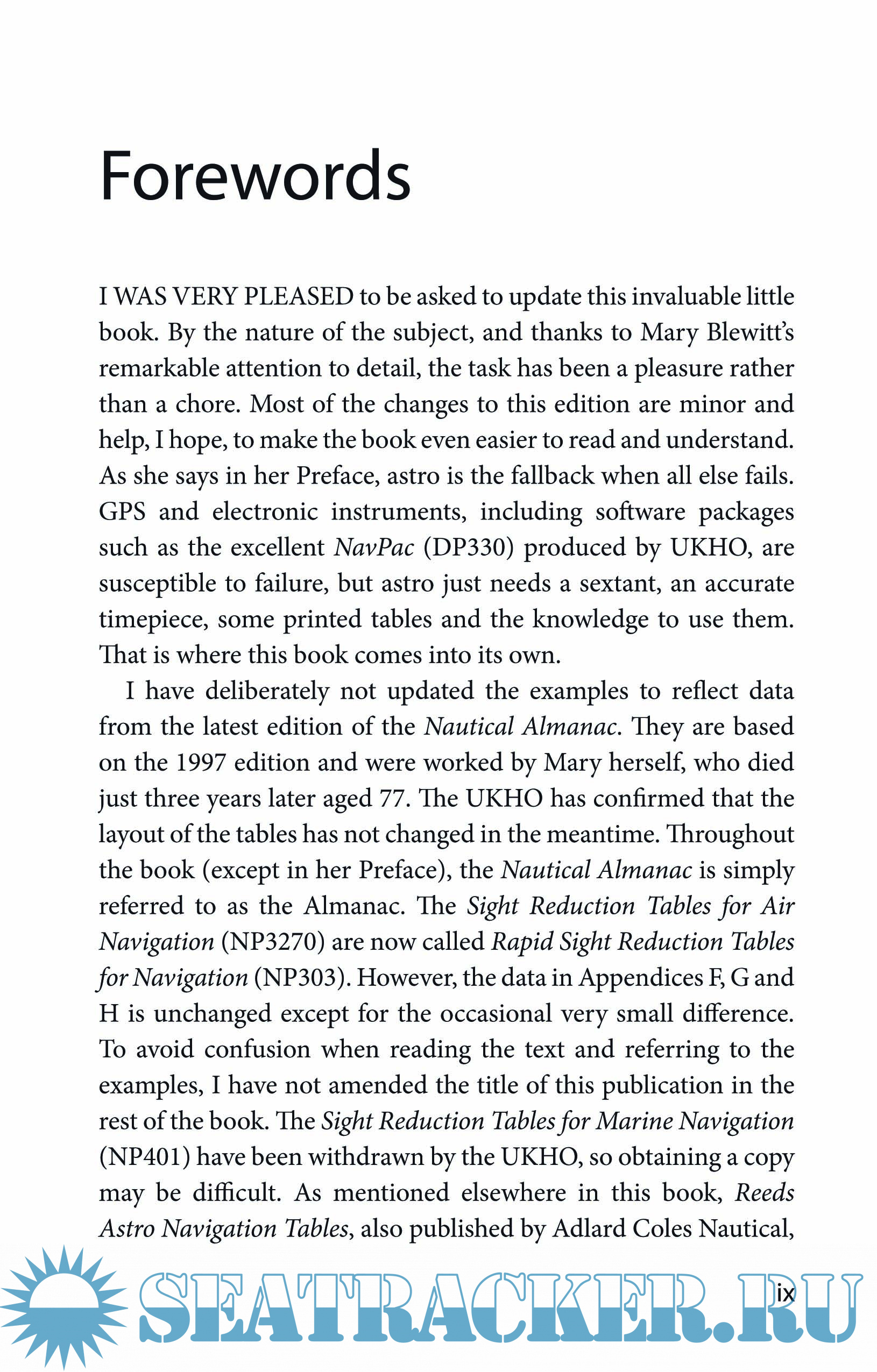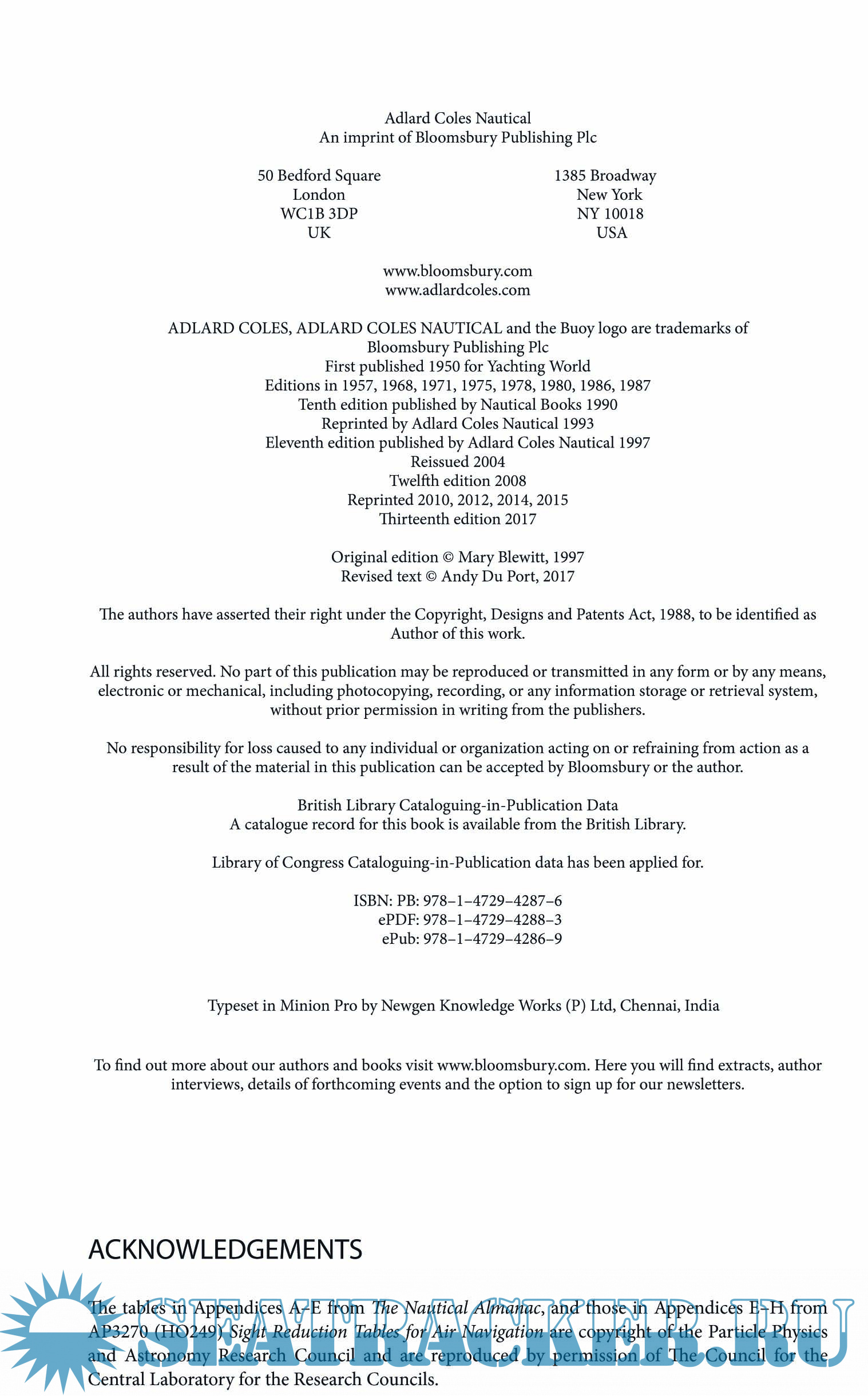 Year: 2017 Language: english Author: Mary Blewitt Genre: Reference book Publisher: Adlard Coles Edition: 13th ISBN: 978–1–4729–4288–3 Format: PDF Quality: eBook Pages count: 78 Description: Huge advances in electronic navigation since the original publication of Celestial Navigation have transported offshore navigators to a world of press-button convenience. Traditional navigation skills--and technology-free position finding--are still vital, though, especially when things go wrong, as they will: batteries fail, antennas go overboard, and electronics get wet. Knowledge of celestial navigation is a life-saving emergency skill; it is also a rite of initiation and its practice still a favorite pastime among serious cruisers. A bestseller for over 65 years, Celestial Navigation for Yachtsmen is a model of simplicity and clarity. The only mathematics involved are addition and subtraction, which explains why this book has truly earned its reputation for admirable conciseness and for making a tricky subject easy to understand. This edition has been thoroughly revised by Andy Du Port, the highly respected past editor of Reeds Almanacs.
