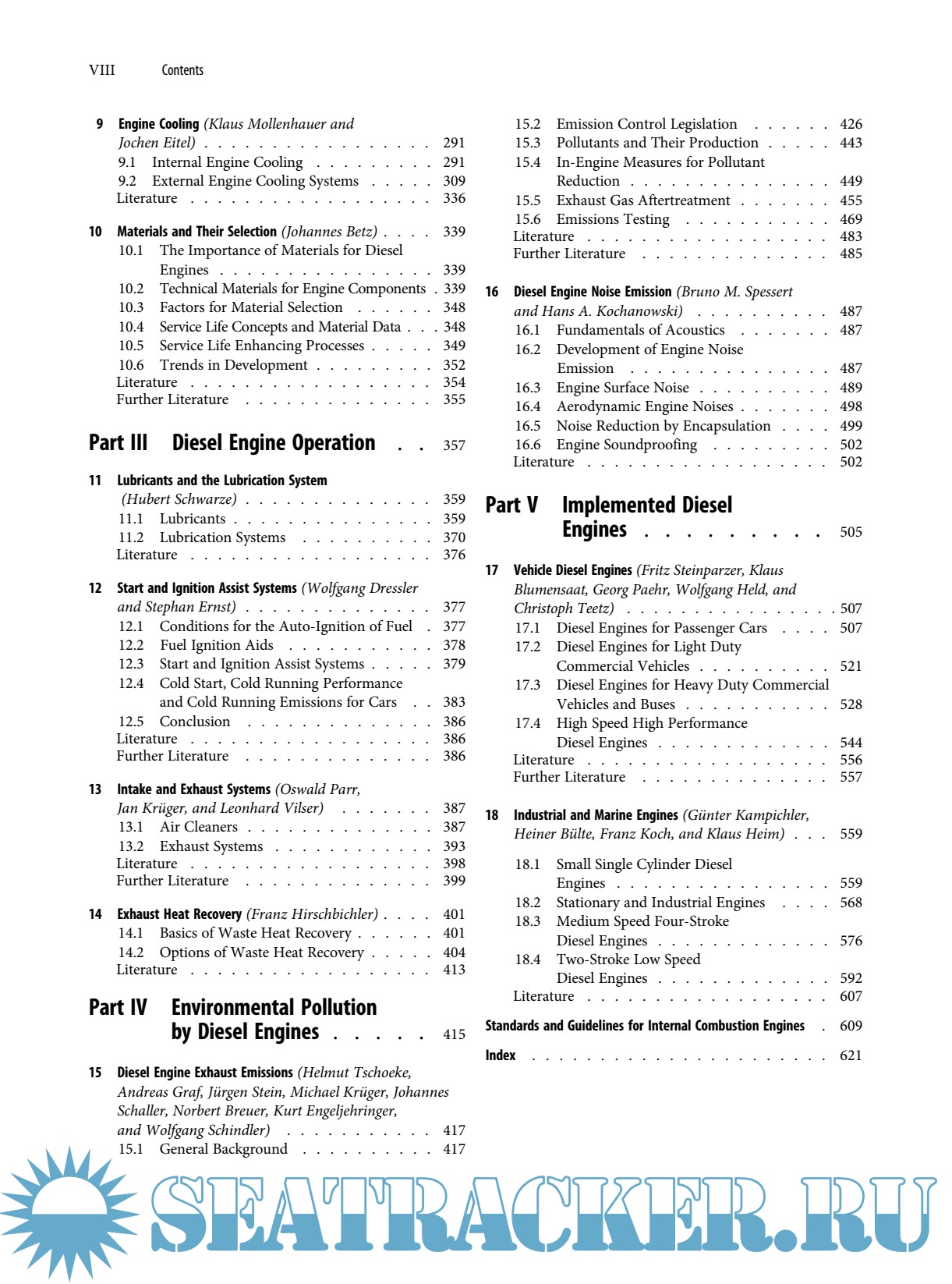 New combustion systems with a larger share of premixed, homogeneous combustion than normal diffusion combustion are just as much the subject of this handbook as the refinement of supercharging to enhance the power output, increase the peak cylinder pressure and thus limit load as the brake mean effective pressure increases. Quickly emerging as the optimal injection system when the car sector switched from indirect to direct injection at the end of the 1990s, the common rail system also came to be used – initially only experimentally – for larger diesel engines at the start of the new millennium. The common rail system is now standard in diesel engines Vof virtually every size. Hence, reflecting current but by far not yet finalized development, this handbook treats the different designs, e.g. with solenoid valvecontrolled or piezo-actuated injectors, in detail. Ample space has accordingly also been given to electronics with its diverse options to control processes in the engine