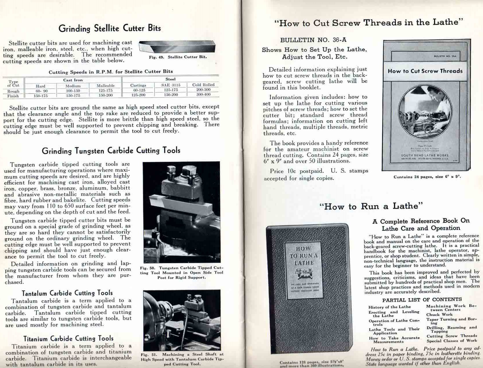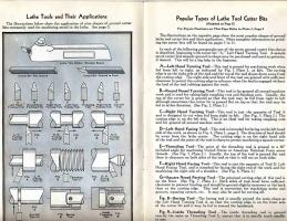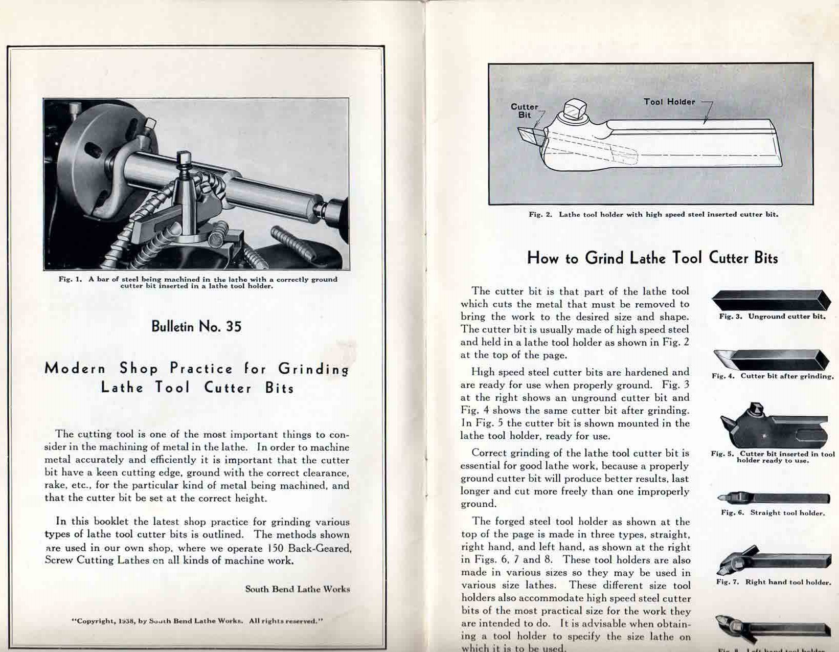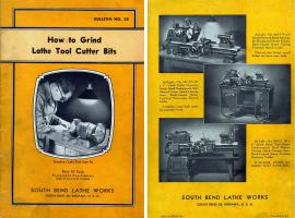 Year: 1938 Language: english Author: South Bend Lathe Works Publisher: SOUTH BEND LATHE WORKS Format: PDF Quality: Scanned pages Number of pages: 16 Description: Bulletin No. 35 Modern Shop Practice for Grinding Lathe Tool Cutter Bits 1 he cutting tool is one of the most important things to consider in the machining of metal in the lathe. In order to machine metal accurately and efficiently it is important that the cutter bit have a keen cutting edge, ground with the correct clearance, rake, etc., for the particular kind of metal being machined, and that the cutter bit be set at the correct height. In this booklet the latest shop practice for grinding various types of lathe tool cutter bits is outlined. The methods shown are used in our own shop, where we operate 150 Back-Geared, Screw Cutting Lathes on all kinds of machine work. The cutter bit is that part of the lathe tool which cuts the metal that must be removed to bring the work to the desired size and shape. The cutter bit is usually made of high speed steel and held in a lathe tool holder as shown in Fig. 2 at the top of the page. High speed steel cutter bits are hardened and are ready for use when properly ground. Fig. 3 at the right shows an unground cutter bit and Fig. 4 shows the same cutter bit after grinding. In I ig. 5 the cutter bit is shown mounted in the lathe tool holder, ready for use. Correct grinding of the lathe tool cutter bit is essential for good lathe work, because a properly ground cutter bit will produce better results, last longer and cut more freely than one improperly ground. I he forged steel tool holder as shown at the top of the page is made in three types, straight, right hand, and left hand, as shown at the right in Figs. 6, 1 and 8. These tool holders are also made in various sizes so they may be used in various size lathes. I hese different size tool holders also accommodate high speed steel cutter bits of the most practical size for the work they are intended to do. It is advisable when obtaining a tool holder to specify the size lathe on