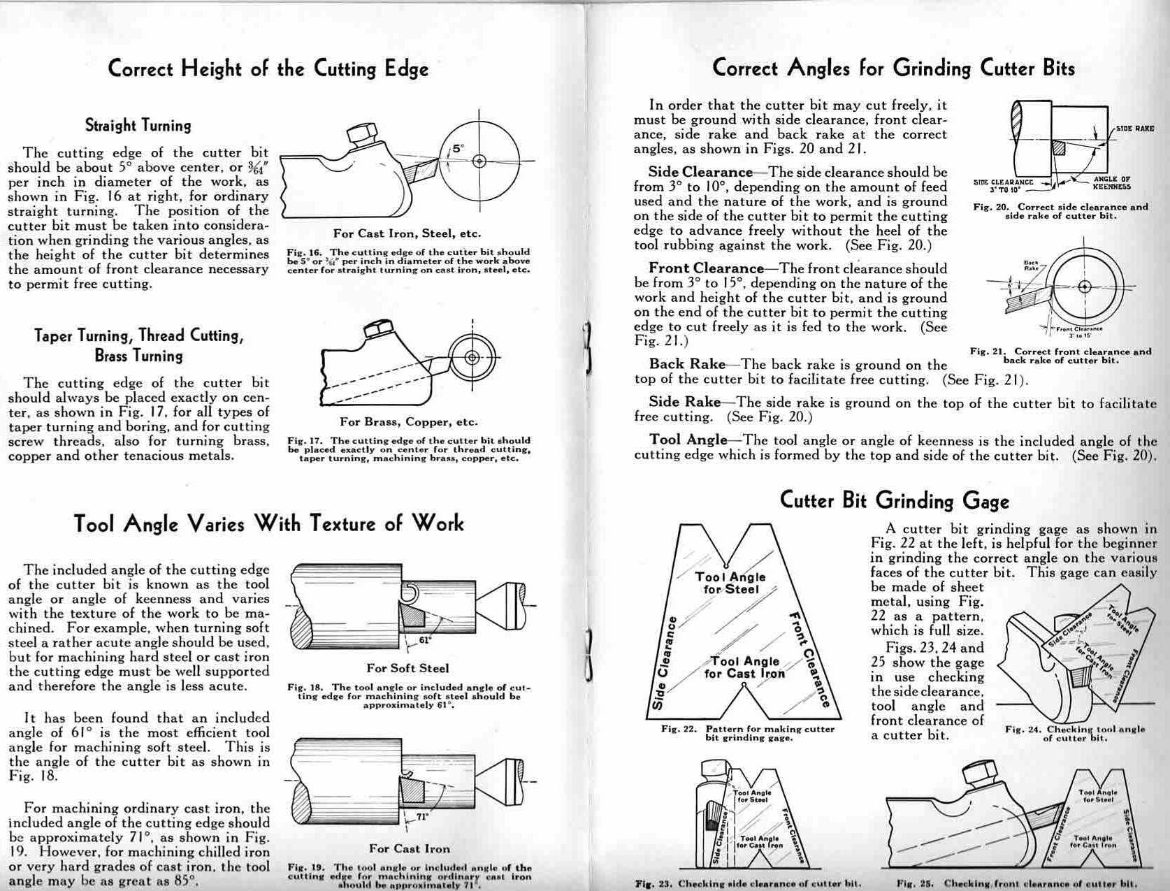 In order that the cutter bit may cut freely, it must be ground with side clearance, front clearance, side rake and back rake at the correct angles, as shown in Figs. 20 and 21.