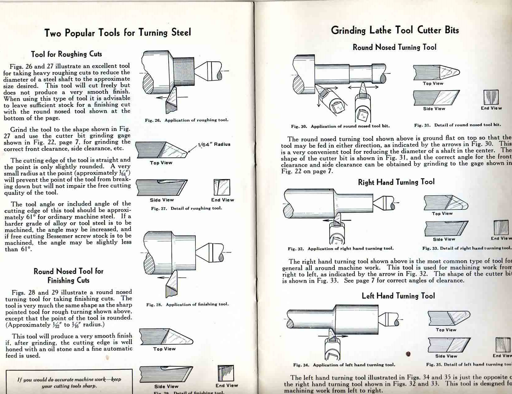 The right hand turning tool shown above is the most common type of tool foi general all around machine work. This tool is used for machining work froit right to left, as indicated by the arrow in Fig. 32. The shape of the cutter bil is shown in Fig. 33. See page 7 for correct angles of clearance.
