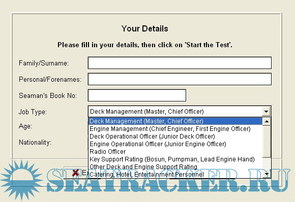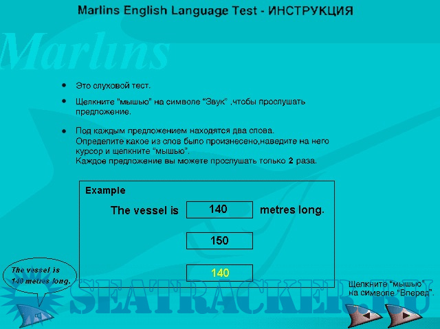 Тест на знание английского языка для плавсостава. Количество запусков не ограничено. Программа широко используется иногда в крюнинговых компаниях. Если вам не нужна аттестация плавсостава по специальностям на английском языке, а только проверка грамматики английского языка для плавсостава, то эта программа для Вас.