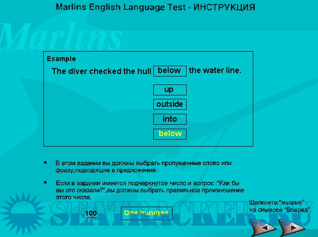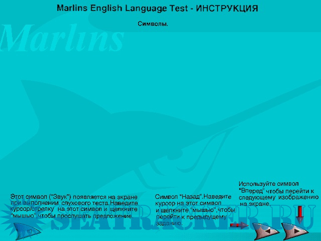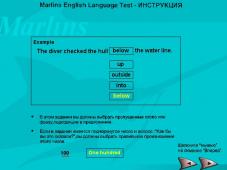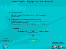 Какие-либо картинки к вопросам отсутствуют. Просмотреть правильные или неправильные ответы невозможно. Можно только увидеть общий результат теста в %, по таким параметрам в % как: Listening , Reading , General. Требования в Компаниях - не менее 65% общий результат прохождения аттестации. Но в Лондонском "Зодиаке" не менее 90%. тестирование проводится в "обучающем" (когда пользователю автоматически предлагается правильный ответ) и "экзаменационном" режимах. Результаты тестирования фиксируются в виде отчетов, которые далее предлагается распечатать на принтере. На основании полученных результатов программа дает рекомендации по изучению того или иного раздела Marlins Progress Test. отличное пособие для самопроверки.