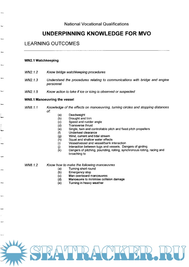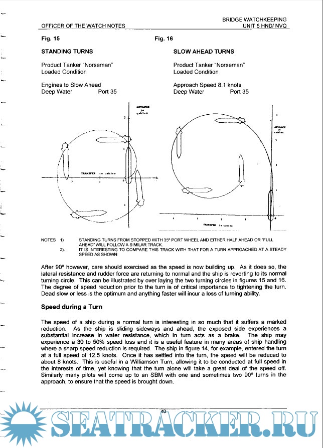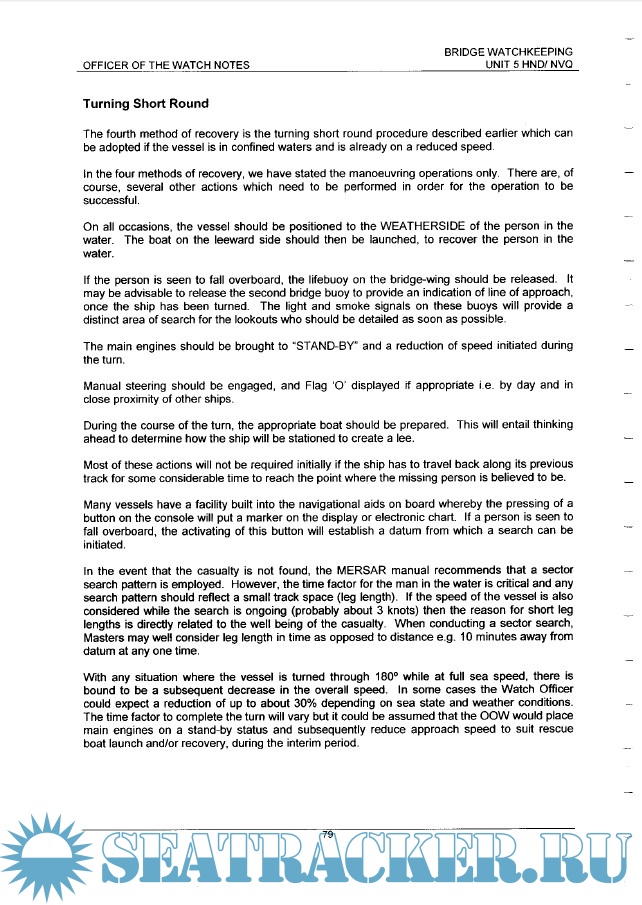 Year: 2006 Language: english Author: Blackpool and The Fylde College Fleetwood Nautical Campus Genre: Training courses Publisher: Blackpool and The Fylde College Fleetwood Nautical Campus Format: PDF Quality: OCR with errors Pages count: 88 Description: Unit 5: Watchkeeping: •Know bridge watchkeeping procedures •Understand the procedures relating to communications with bridge and engine personnel •Know action to take if ice or icing is observed or suspected Manoeuvring the vessel: •Knowledge of the effects on manoeuvring, turning circles and stopping distances of: (a) Deadweight (b) Draught and trim (c) Speed and rudder angle (d) Transverse thrust (e) Single, twin and controllable pitch and fixed pitch propellers (f) Underkeelclearance (g) wind, current and tidal stream (h) Squat and shallow water effects (i) Vessel/vessel and vessel/bank interaction (j) Interaction between tugs and vessels. Dangers of girding (k) Dangerso f pitching, pounding, rollings, synchronous rolling, racing and broaching to. •Know how to make the following manoeuvres (a) Turning short round (b) Emergency stop (c) Man overboard manoeuvres (d) Manoeuvre to minimise collision damage (e) Turning in heavy weather