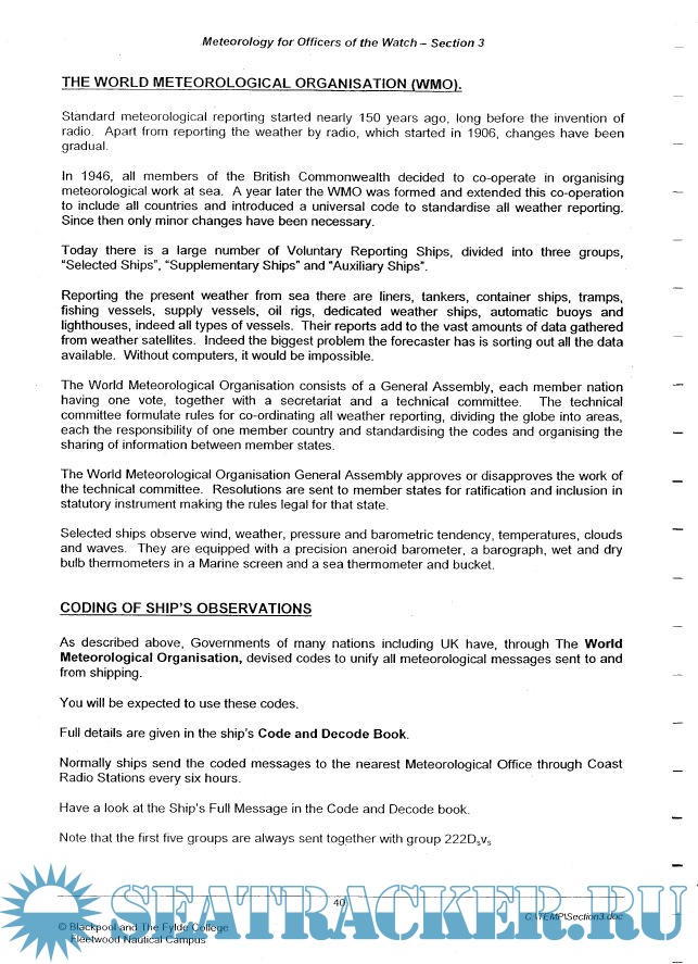 Year: 2006 Language: english Author: Blackpool and The Fylde College Fleetwood Nautical Campus Genre: Training courses Publisher: Blackpool and The Fylde College Fleetwood Nautical Campus Format: PDF Quality: OCR with errors Pages count: 246 Description: Section 1: Atmospheric pressure and humidity. Section 2: Pressure Systems, Winds and Currents. Section 3: Instruments, Observations and Coding.