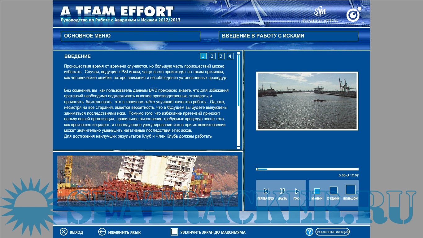 Year: 2012 Localization: russian / english Developer: Steamship Mutual Genre: Education Format: ISO System Requirements: Windows XP & Up Crack: Not needed Description: Accidents will happen - but most accidents are avoidable. Those which give rise to P&I claims are mostly caused by human error, ranging from a momentary lack of attention to a long build-up of poor operating procedures.No doubt you as the user of this DVD are well aware of the importance of the high standards of practice and vigilance needed to avoid claims, and of the operational benefits of so doing. However, in spite of your and others' best efforts, the likelihood is that you will be involved in the aftermath of a claim at some point in the future. In the same way that claims avoidance benefits your organization so following the correct procedures in reacting to incidents and dealing with claims when they arise can greatly reduce the ultimate impact of those claims. To get the best results Club and Member needs to work closely together as the principal players in the claims handling team from the time of the incident until the resolution of the claim. This DVD is designed to help you to play your part in that process.-Происшеcтвия время от времени случаются, но большую часть происшеcтвий можно избежать. Случаи, ведущие к искам, чаще всего происходят по таким причинам, как человеческие ошибки, потеря внимания и несоблюдение установленных процедур. к пользователь данным DVD прекрасно знаете, что для избежания претензий необходимо поддерживать высокие производственные стандарты и проявлять бдительность, что в конечном счёте улучшает качество работы. Однако, несмотря на все старания, имеется вероятность, что в будущем вы будете вынуждены заниматься последствиями иска. Помимо того, что избежание претензий приносит пользу вашей организации, правильное выполнение требуемых процедур после того, как произошел инцидент, и последующее урегулирование исков при их возникновении может значительно уменьшить негативные последствия этих исков. Для достижения наилучших результатов Клуб и Член Клуба должны работать совместно в качестве основных участников группы, занимающейся урегулированием иска, начиная от момента, когда произошел инцидент, и до разрешения иска. Данный DVD поможет вам выполнять вашу роль в этом процессе.