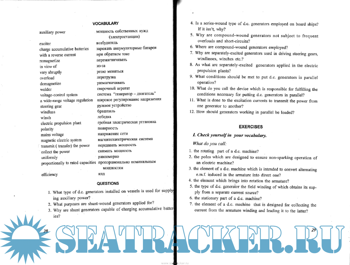 Настоящее учебное пособие имеет своей целью обучение специальному английскому морскому языку в области электротехники и предназначено как для студентов старших курсов энергетических факультетов высших мореходных учебных заведений, так и для судовых электромехаников и механиков, желающих усовершенствовать свои знания л области профессионального морского английского языка.