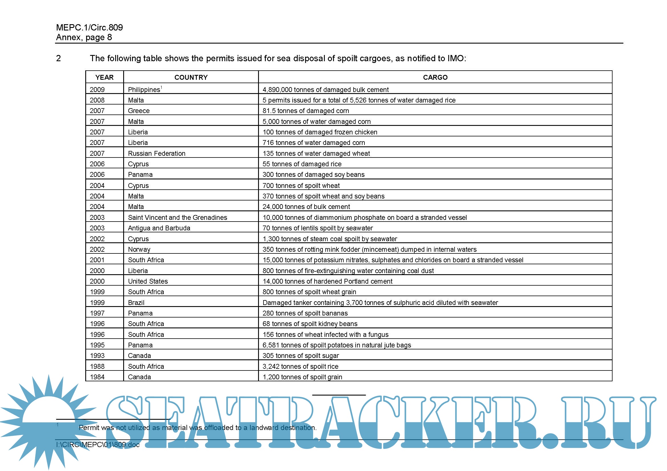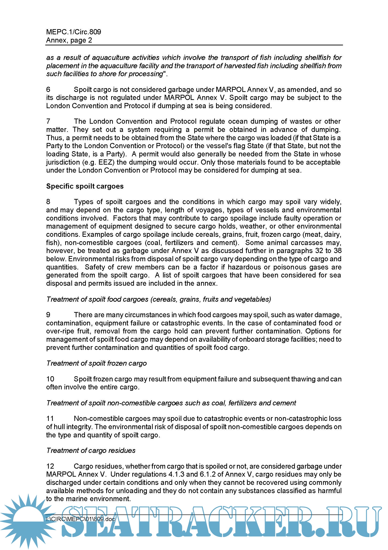 Page 3 Introduction Page 3 Applicability of the London Convention and Protocol (LC/LP) and MARPOL Annex V to the management of spoilt cargoes Page 4 Specific spoilt cargoes Page 5 Contingency plans for the management of spoilt cargo Page 5 Considerations for documenting spoilt cargo Page 6 Applying for a permit Page 6 Emergency permits Page 6 Mitigation for invasive species and pathogens in some spoilt cargoes Page 7 Alternative options when dumping at sea is not allowed Page 7 Treatment of animal carcasses Page 9 ANNEX - SPOILT Cargoes Considered for Sea Disposal