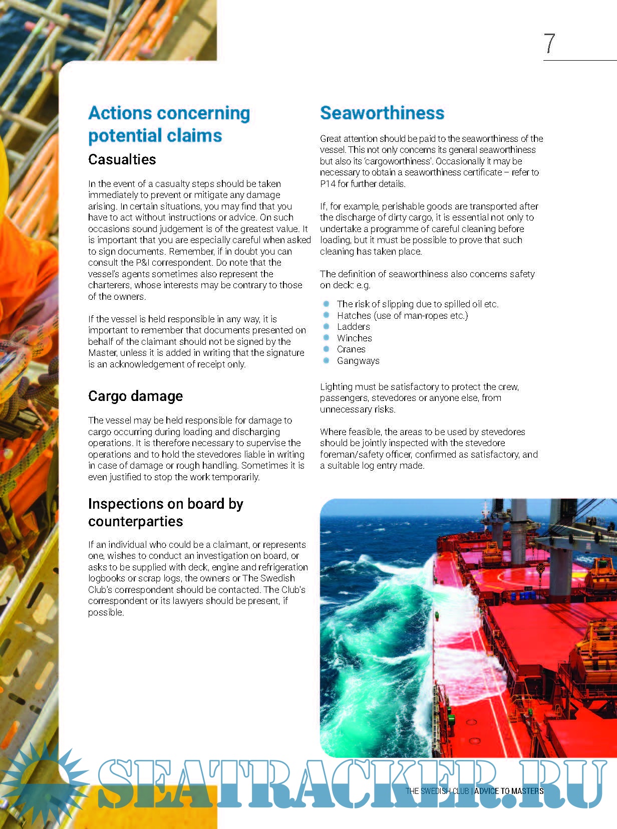 Description: In any casualty, as the Master, you play a crucial role. You are on the scene, with the ability to minimise the consequences of the casualty, and to facilitate the handling of matters between the owners and The Swedish Club. Advice to Masters is designed to support that process and not