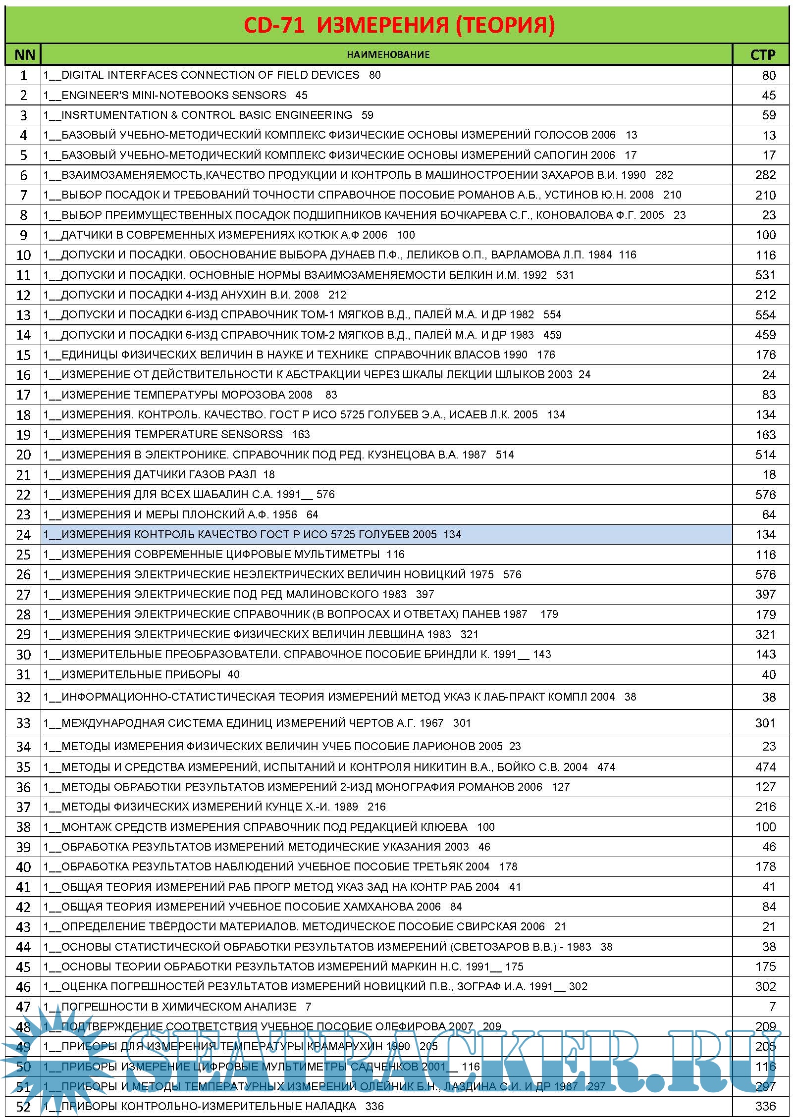 CD‐71 МЕТРОЛОГИЯ, СТАНДАРТИЗАЦИЯ, (ТЕОРИЯ) NN НАИМЕНОВАНИЕ СТР 1 1__ВЗАИМОЗАМЕНЯЕМОСТЬ,СТАНДАРТИЗАЦИЯ И ТЕХНИЧЕСКИЕ ИЗМЕРЕНИЯ ДУНИН-БАРКОВСКИЙ И.В. 1987 351 351 2 1__ВЗАИМОЗАМЕНЯЕМОСТЬ,СТАНДАРТИЗАЦИЯ И ТЕХНИЧЕСКИЕ ИЗМЕРЕНИЯ ПОСОБИЕ К РЕШ. ЗАДАЧ ЕГОРОВ А.А. 2003 113 3 1__ВЗАИМОЗАМЕНЯЕМОСТЬ,СТАНДАРТИЗАЦИЯ И ТЕХНИЧЕСКИЕ ИЗМЕРЕНИЯ ЯКУШЕВ А.И., ВОРОНЦОВ Л.Н., 1986 351 4 1__ВСЁ О МЕТРОЛОГИИ 113 113 5 1__ИСТОРИЯ МЕТРОЛОГИИ СТАНДАРТИЗАЦИИ СЕРТИФИКЦИИ И УПРАВЛЕНИЯ КАЧЕСТВОМ МИЩЕНКО С.В. 2004 72 6 1__КАРМАННЫЙ СПРАВОЧНИК ИНЖЕНЕРА МЕТРОЛОГА БОЛТОН М, ДОДЭКА, 2002 390 390 7 1__КАЧЕСТВО ИЗМЕРЕНИЙ МЕТРОЛОГИЧЕСКАЯ СПРАВОЧНАЯ КНИГА СЕЛИВАНОВ 1987 289 289 8 1__ЛЕКЦИИ ПО ТЕОРЕТИЧЕСКОЙ МЕТРОЛОГИИ ЦИТОВИЧ Б.В. 129 129 9 1__МЕТРОЛОГИЧЕСКАЯ ЭКСПЕРТИЗА ТЕХНИЧЕСКОЙ ДОКУМЕНТАЦИИ ПРАВИКОВ Ю.М., МУСЛИНА Г.Р. 2005 21 21 10 1__МЕТРОЛОГИЧЕСКОЕ ОБЕСПЕЧЕНИЕ ИЗМЕРИТЕЛЬНЫХ СИСТЕМ ДАНИЛОВ А.А. 2008 63 63 11 1__МЕТРОЛОГИЯ,ВЗАИМОЗАМЕНЯЕМОСТЬ И СТАНДАРТИЗАЦИЯ СТОЛЯРОВА Т.В.,КУВШИНОВА В.А. 2005 112 112 12 1__МЕТРОЛОГИЯ,СТАНДАРТИЗАЦИЯ,СЕРТИФИКАЦИЯ БАТАЛОВ А.П. 2003 66 66 13 1__МЕТРОЛОГИЯ,СТАНДАРТИЗАЦИЯ И СЕРТИФИКАЦИЯ. ШПАРГАЛКА АЛЕКСЕЕВ 72 72 14 1__МЕТРОЛОГИЯ,СТАНДАРТИЗАЦИЯ И СЕРТИФИКАЦИЯ 2-ИЗД ДИМОВ 2002 432 432 15 1__МЕТРОЛОГИЯ,СТАНДАРТИЗАЦИЯ И СЕРТИФИКАЦИЯ В ЭНЕРГЕТИКЕ ЗАЙЦЕВ С.А.,ТОЛСТОВ А.Н. 2009 221 221 16 1__МЕТРОЛОГИЯ,СТАНДАРТИЗАЦИЯ И СЕРТИФИКАЦИЯ ГЕРАСИМОВА Е.Б.,ГЕРАСИМОВ Б.И. 2010 226 226 17 1__МЕТРОЛОГИЯ,СТАНДАРТИЗАЦИЯ И СЕРТИФИКАЦИЯ ГОНЧАРОВ А.А.,КОПЫЛОВ В.Д. 2008 241 241 18 1__МЕТРОЛОГИЯ,СТАНДАРТИЗАЦИЯ И СЕРТИФИКАЦИЯ ДЕМИДОВА, ЯКОРЕВА, БИСЕРОВА 66 66 19 1__МЕТРОЛОГИЯ,СТАНДАРТИЗАЦИЯ И СЕРТИФИКАЦИЯ ДИМОВ Ю.В. 2004 432 432 20 1__МЕТРОЛОГИЯ,СТАНДАРТИЗАЦИЯ И СЕРТИФИКАЦИЯ КЛЕВЛЕЕВ В.М.,КУЗНЕЦОВА И.А.,ПОПОВ Ю.П. 2004 251 251 21 1__МЕТРОЛОГИЯ,СТАНДАРТИЗАЦИЯ И СЕРТИФИКАЦИЯ КОНСПЕКТ ЛЕКЦИЙ ДЕМИДОВА, ЯКОРЕВА, БИСЕРОВА 136 136 22 1__МЕТРОЛОГИЯ,СТАНДАРТИЗАЦИЯ И СЕРТИФИКАЦИЯ МОКРОВ Ю.В. 2007 131 131 23 1__МЕТРОЛОГИЯ,СТАНДАРТИЗАЦИЯ И СЕРТИФИКАЦИЯ НИКИФОРОВ А.Д.,БАКИЕВ Т.А. 2005 423 432 24 1__МЕТРОЛОГИЯ,СТАНДАРТИЗАЦИЯ И СЕРТИФИКАЦИЯ РАДКЕВИЧ Я.М.,СХИРТЛАДЗЕ А.Г.,ЛАКТИОНОВ Б.И. 2004 770 770 25 1__МЕТРОЛОГИЯ,СТАНДАРТИЗАЦИЯ И ТЕХНИЧЕСКИЕ СРЕДСТВА ИЗМЕРЕНИЙ ТАРТАКОВСКИЙ Д.Ф.,ЯСТРЕБОВ А.С. 2001 207 26 1__МЕТРОЛОГИЯ,СТАНДАРТИЗАЦИЯ И ТЕХНИЧ ИЗМЕРЕНИЯ РАБОЧАЯ ПРОГРАММА 2001__17 17 27 1__МЕТРОЛОГИЯ,СТАНДАРТИЗАЦИЯ И ТЕХНИЧ СРЕДСТВ ИЗМЕРЕНИЯ ТАТАРКОВСКИЙ 2001__ 207 207 28 1__МЕТРОЛОГИЯ,СТАНДАРТИЗАЦИЯ СЕРТИФ ПРОГР МЕТОД УКАЗ-ИЯ И КОНТР ЗАД 1999 7 7 29 1__МЕТРОЛОГИЯ.ТЕКСТЫ ЛЕКЦИЙ БИРЮКОВ С.В. ЧЕРЕДОВ А.И. 2000 110 110 30 1__МЕТРОЛОГИЯ В ВОПРОСАХ И ОТВЕТАХ ГОРБОКОНЕНКО В.Д., ШИКИНА В.Е. 2005 197 197 31 1__МЕТРОЛОГИЯ И ВЗАИМОЗАМЕНЯЕМОСТЬ ЛАКТИОНОВ 1995 214 214 32 1__МЕТРОЛОГИЯ И ОБЕСПЕЧЕНИЕ КАЧЕСТВА КОЛИЧЕСТВЕННОГО ХИМИЧЕСКОГО АНАЛИЗА М, ХИМИЯ,ДВОРКИН В.И. 2001 267 33 1__МЕТРОЛОГИЯ И СТАНДАРТИЗАЦИЯ КОЗЛОВ М.Г. 2001__ 259 259 34 1__МЕТРОЛОГИЯ КОНСПЕКТ ЛЕКЦИЙ РАЗИНКИН 145 145 35 1__МЕТРОЛОГИЯ УЧЕБНИК СЕРГЕЕВ А.Г. 2005 275 275 36 1__ОСНОВЫ МЕТРОЛОГИИ. ПРАКТИКУМ ПО МЕТРОЛОГИИ И ИЗМЕРЕНИЯМ ПРОНКИН Н.С. 2007 395 395 37 1__ОСНОВЫ МЕТРОЛОГИИ. УЧЕБНОЕ ПОСОБИЕ ДЛЯ ВУЗОВ БУРДУН Г.Д., МАРКОВ Б.Н. 1985 257 257 38 1__ОСНОВЫ МЕТРОЛОГИИ И РАДИОИЗМЕРЕНИЯ ДВОРЯШИН Б.В. 1993 320 320 39 1__ОСНОВЫ СТАНДАРТИЗАЦИИ, ДОПУСКИ, ПОСАДКИ И ТЕХНИЧЕСКИЕ ИЗМЕРЕНИЯ САЛОМАХО В.Л. 2004 296 296 40 1__ОСНОВЫ СТАНДАРТИЗАЦИИ, СЕРТИФИКАЦИИ, МЕТРОЛОГИИ 2-ИЗД КРЫЛОВА Г.Д. 1999__ 340 340 41 1__ОСНОВЫ СТАНДАРТИЗАЦИИ, СЕРТИФИКАЦИИ, МЕТРОЛОГИИ 3-ИЗД КРЫЛОВА Г.Д. 2003 674 674 42 1__ОСНОВЫ СТАНДАРТИЗАЦИИ ДОПУСКИ ПОСАДКИ И ТЕХНИЧЕСКИЕ ИЗМЕРЕНИЯ КОЗЛОВСКИЙ Н 1982 287 287 43 1__ПРИКЛАДНАЯ МЕТРОЛОГИЯ. УЧЕБНИК ДЛЯ ВУЗОВ УШАКОВ И.Е., ШИШКИН 