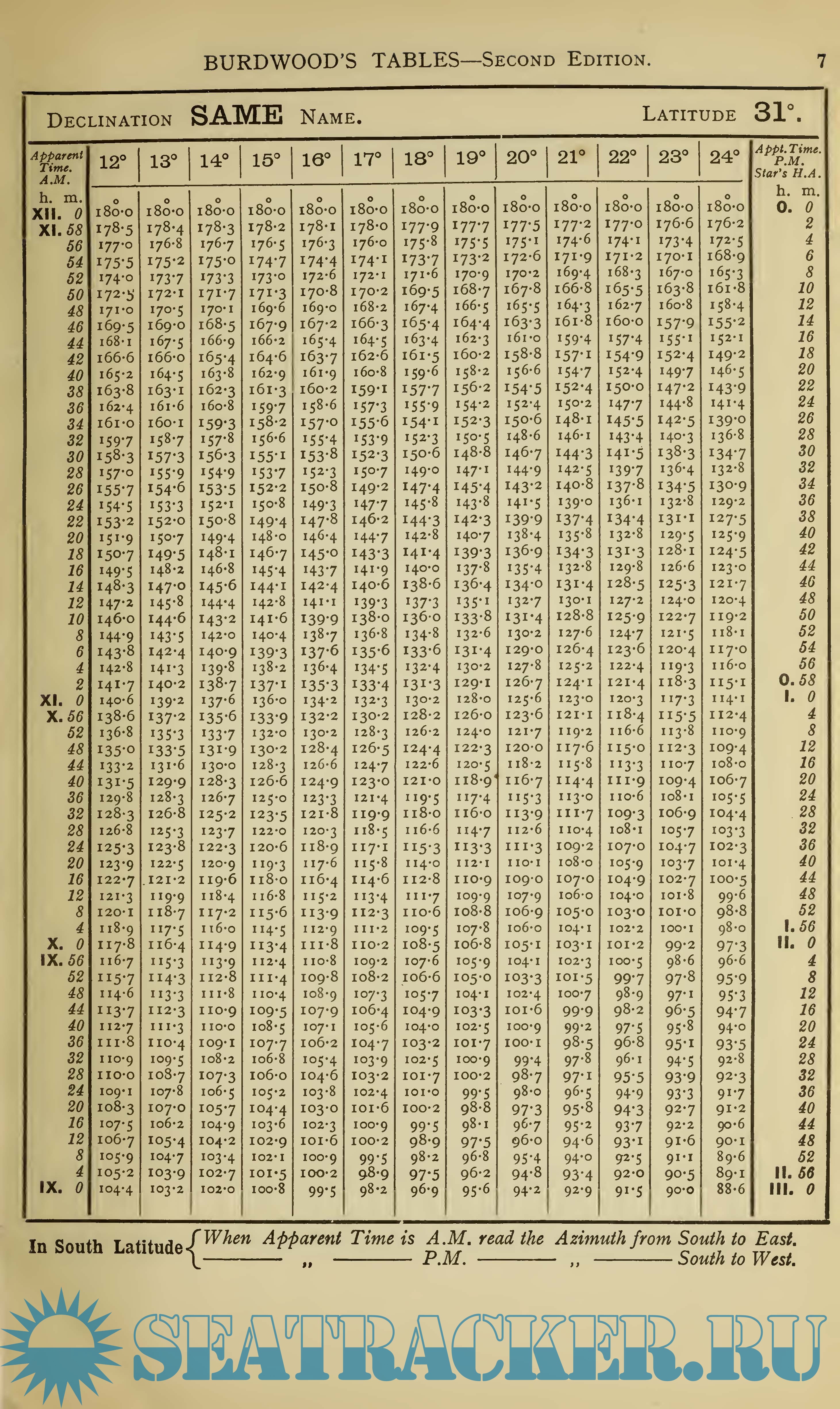 In respect of altitude, the present edition has no limit, azimuths being given from the meridian to the horizon—the latitude limit has been extended to 64 , and there are a few minor alterations which it is hoped will prove useful. As minutes of arc are useless in connection with azimuths, and as they tend to an incorrect idea of accuracy, they are replaced in this book by tenths of degrees, a change which makes for ease and accuracy in the interpolation that is sometimes necessary.