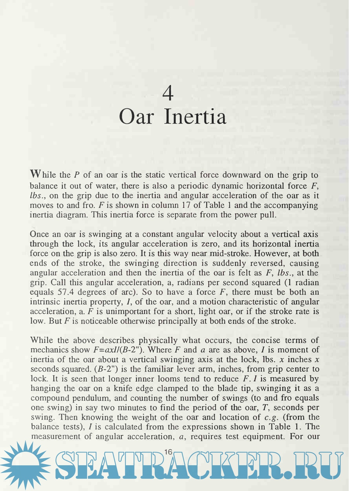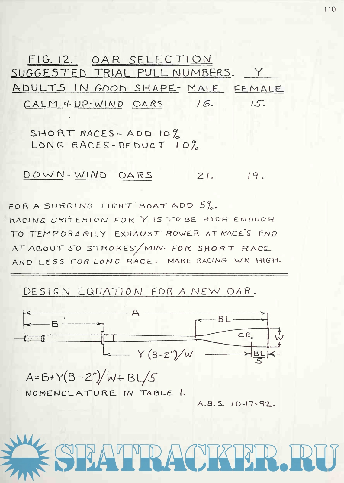 in, namely rowing on the gunwale "in fixed-seat rowboats, one hand per oar," or scull, as oars so used are called. To have enlarged his investigations to include sliding-seat rowing, after the manner of the racing shell, would have required a much more extensive effort than the one reported here. Nevertheless, Steever has laid the groundwork for such an effort, established principles and set up parameters for a scientific investigation of sliding-seat pleasure rowing when such is undertaken.