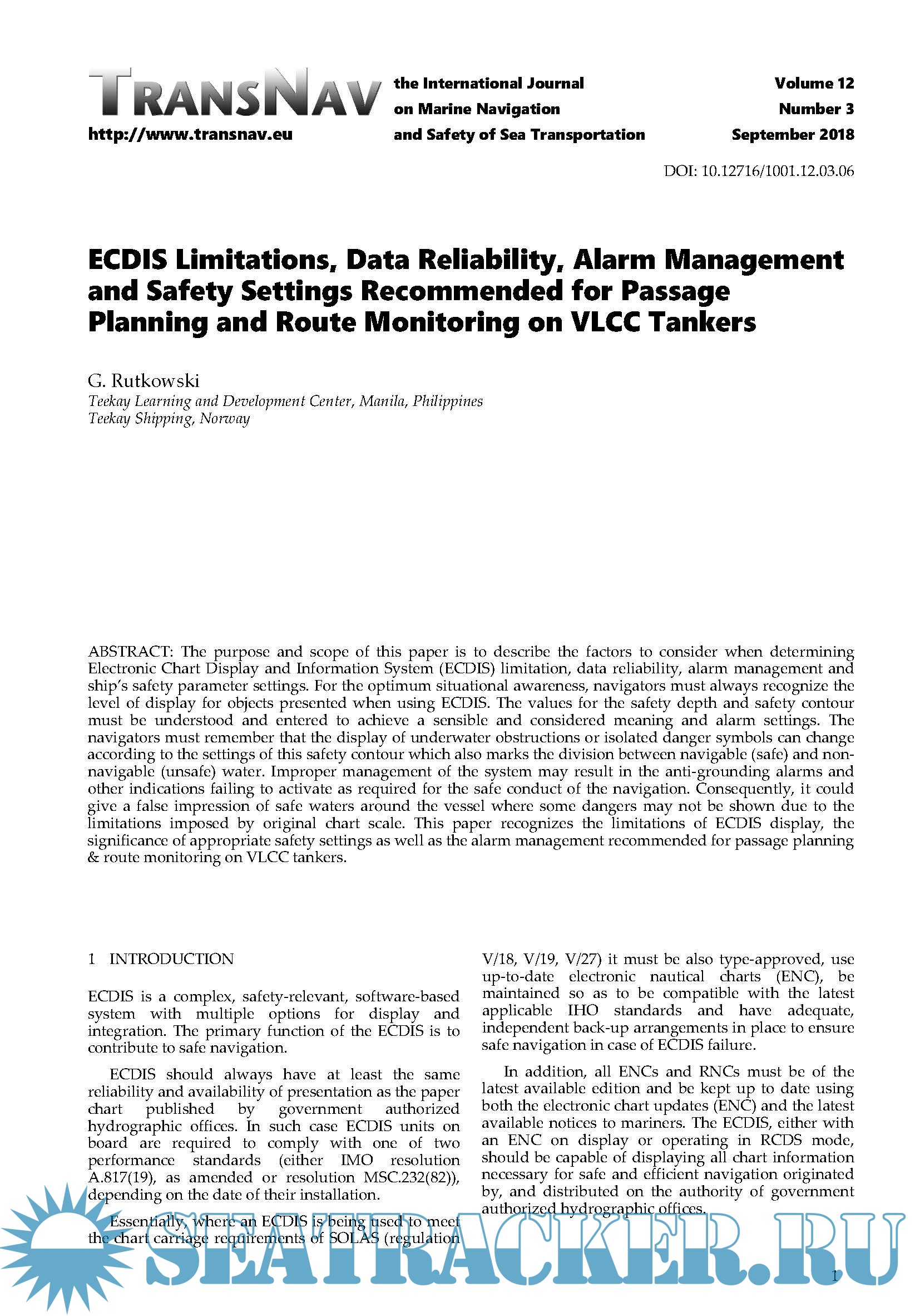 must be understood and entered to achieve a sensible and considered meaning and alarm settings. The navigators must remember that the display of underwater obstructions or isolated danger symbols can change according to the settings of this safety contour which also marks the division between navigable (safe) and non navigable (unsafe) water. Improper management of the system may result in the antigrounding alarms and other indications failing to activate as required for the safe conduct of the navigation. Consequently, it could give a false impression of safe waters around the vessel where some dangers may not be shown due to the limitations imposed by original chart scale. This paper recognizes the limitations of ECDIS display, the significance of appropriate safety settings as well as the alarm management recommended for passage planning & route monitoring on VLCC tankers.