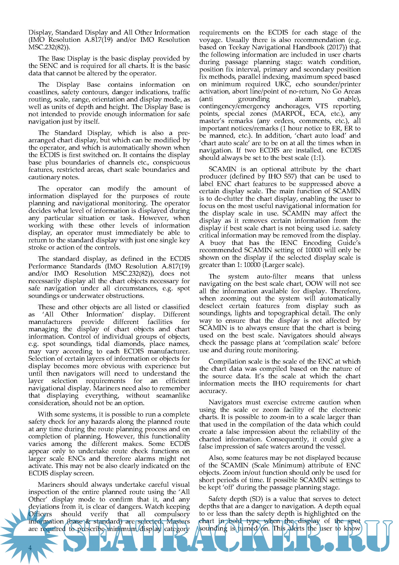 Description: The purpose and scope of this paper is to describe the factors to consider when determining Electronic Chart Display and Information System (ECDIS) limitation, data reliability, alarm management and ship’s safety parameter settings. For the optimum situational awareness, navigators must always recognize the level of display for objects presented when using ECDIS. The values for the safety depth and safety contour