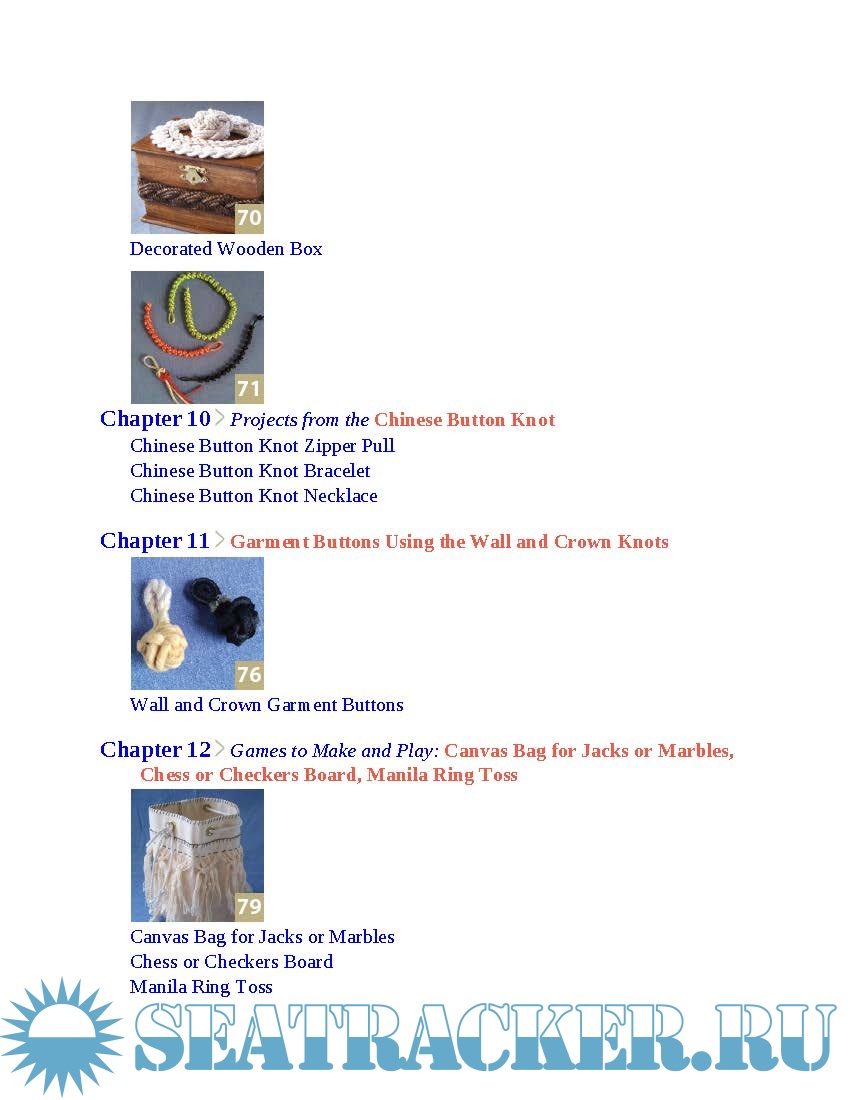 Year: 2014 Language: english Author: Barbara Merry Genre: Handbook Publisher: International Marine/McGraw-Hill Education ISBN: 978-0-07180211-6 Format: PDF Quality: eBook Pages count: 192 Description: Discover the dozens of nautically flavoured craft projects you can make with rope! You will be surprised by the fancy projects you can make with a square knot, a double-French hitching, or four-strand braids (a dog collar, a tool grip, and a decorated picture frame, respectively)! You can also tie the sailor's Turk's Head knot into a bracelet and morph a monkey's fist knot into a doorstop or a fun toy for your dog. Marine artisan Barbara Merry, an expert in artistic marlinspike seamanship skills, shows you how with Marlinspike Sailor's Knots and Crafts. With the help of her expert guidance, you can create more than 30 ropework projects that will add a nautical touch to your boat, RV, camp, or home. Don’t worry if you have never worked with rope in this way before--Barbara will take you step-by-step through the process, from choosing and measuring materials to putting the final touches on your nautical project. Projects are suitable for scout troops or afterschool activities as well!