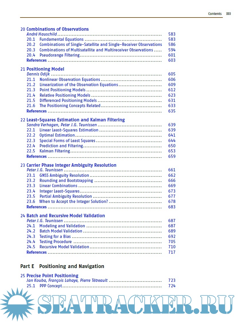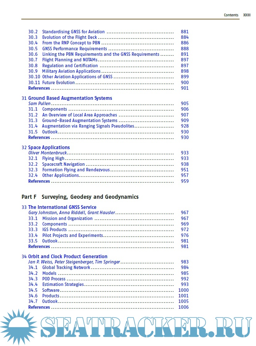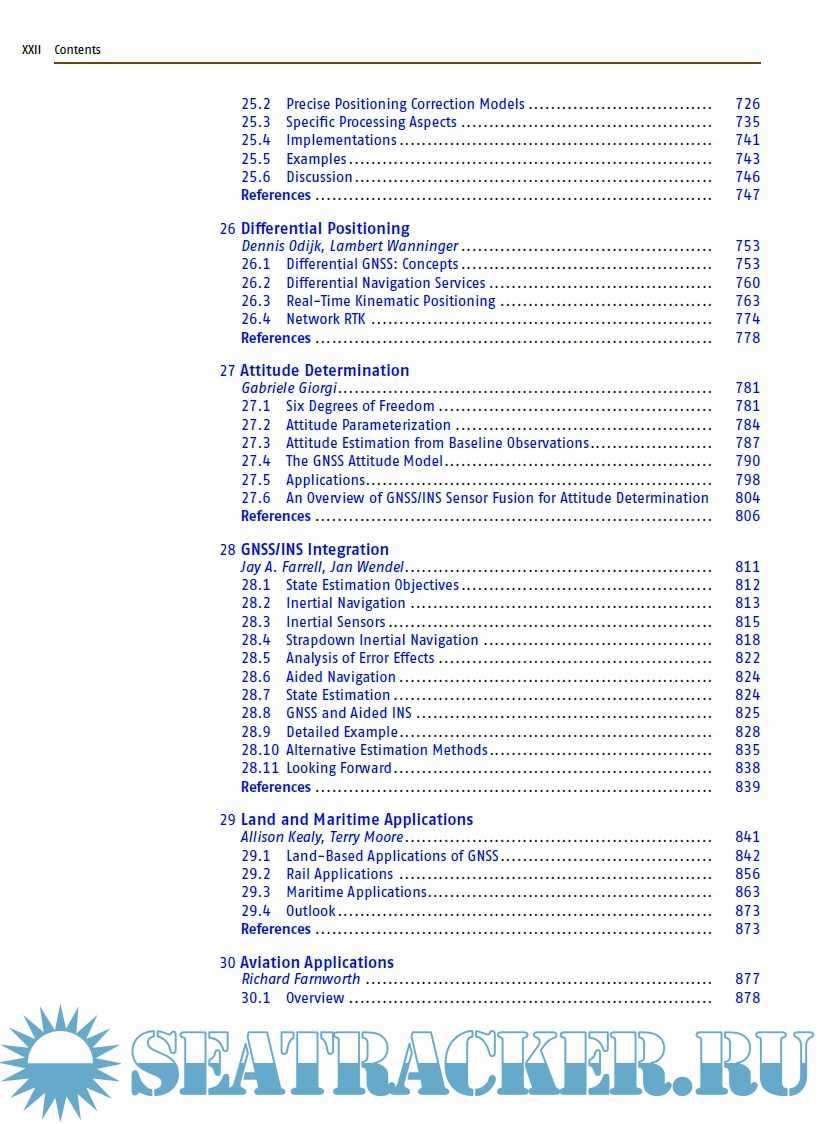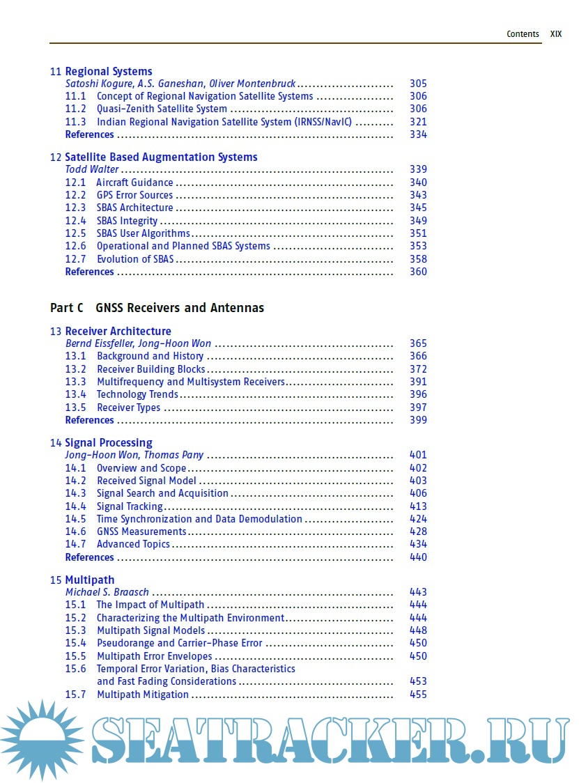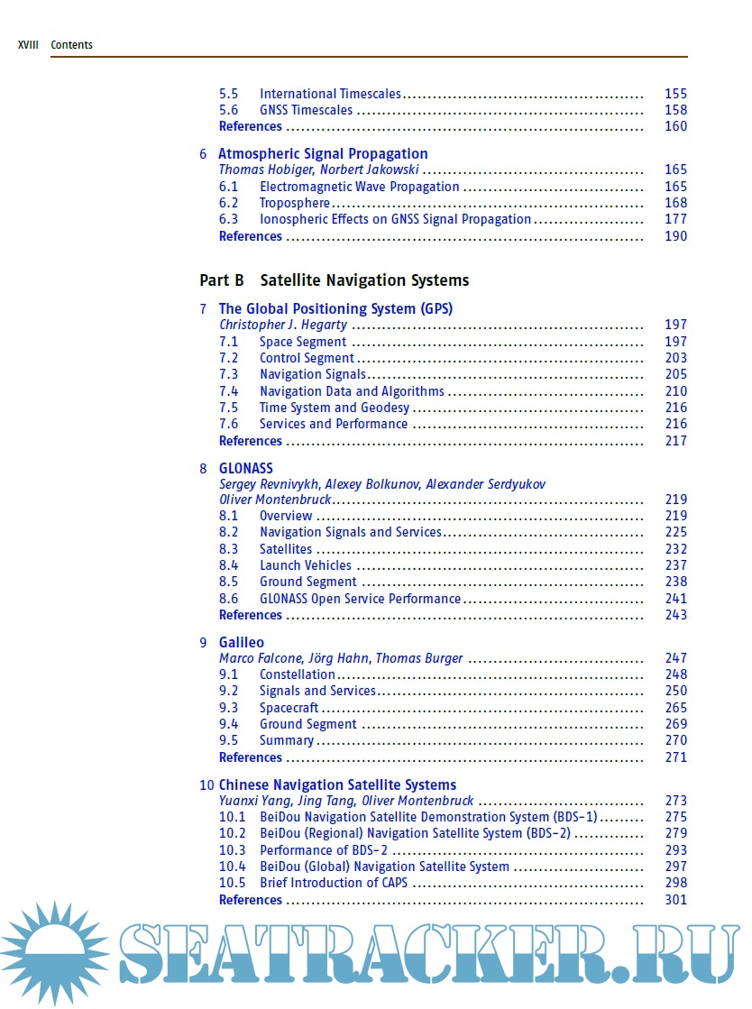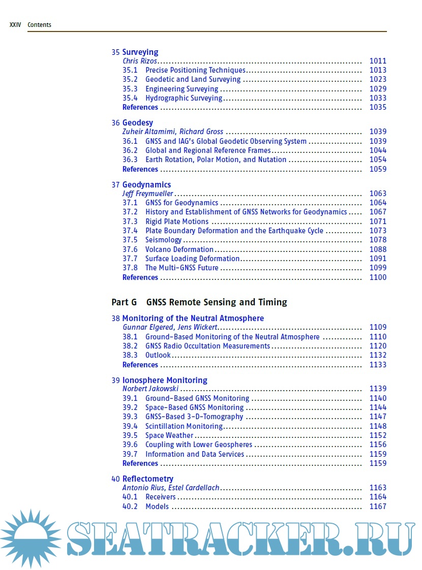 The book is divided in seven distinct parts, each comprising a set of four to eight individual chapters with a common range of topics. For example part A covers the basics of GNSS, in part B one can find a description of all the global, regional, and augmentation systems. Part C presents signal processing, receivers, and antennas. Part D deals with the modern achievements in GNSS algorithms, while part E shows the classical absolute and differential positioning, as well as all the new achievements in precise point positioning and GNSS/INS integration. Part F is dedicated to surveying, geodesy and geodynamics, and Part G to remote sensing and timing. Each of the 41 chapters contains a list of references, from which the reader can deepen the topics. Two annexes show the different receiver and data formats and outline the various GNSS parameters.