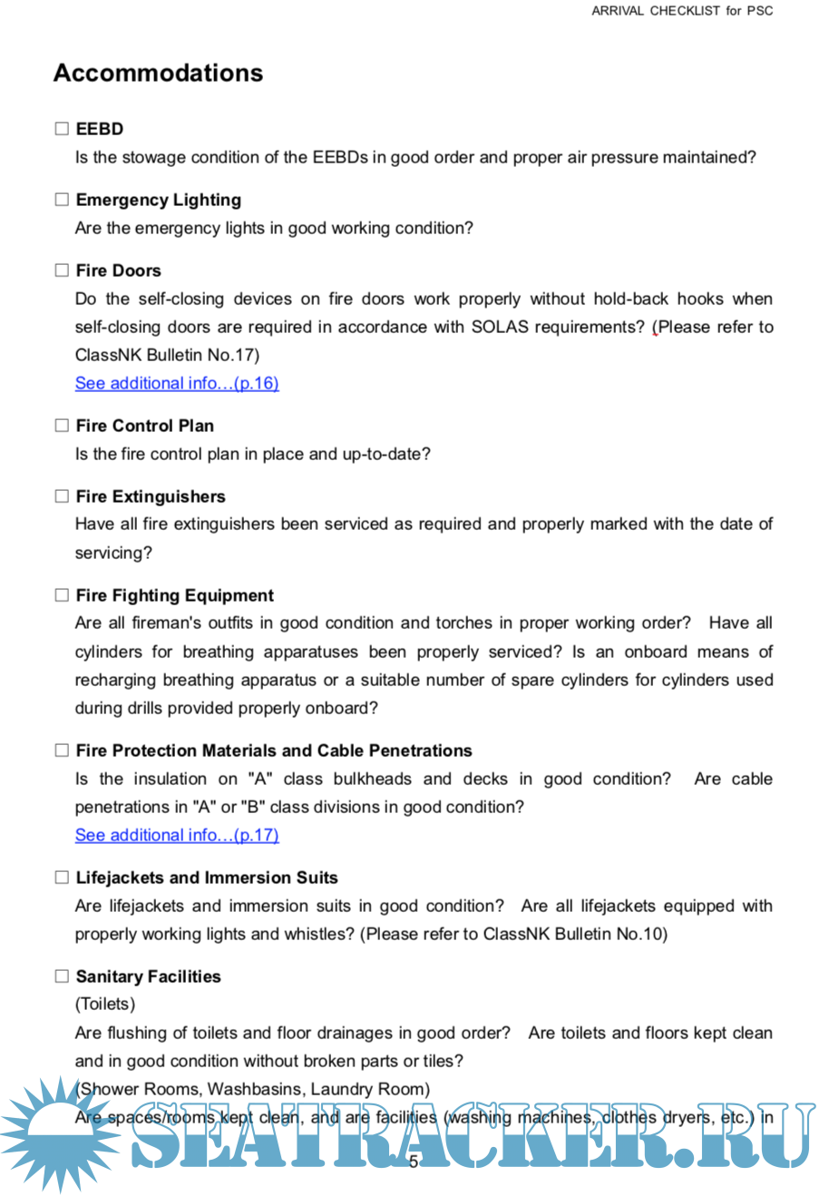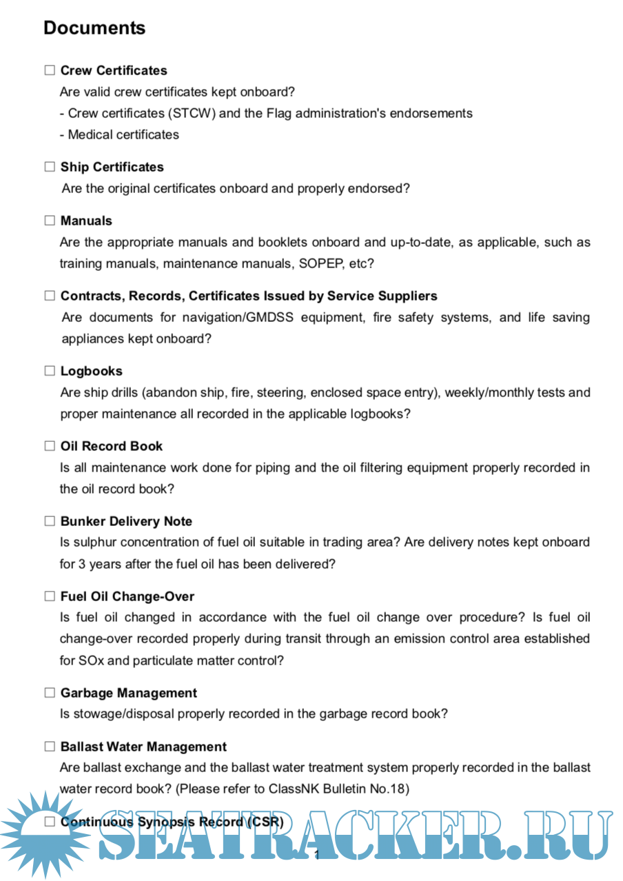 Please note that this checklist is an arrival checklist for port state control. Accordingly, it only covers select items as described above. A more detailed checklist (GOOD MAINTENANCE ON BOARD SHIPS etc. available for download from the NK website)( and in the tracker here: