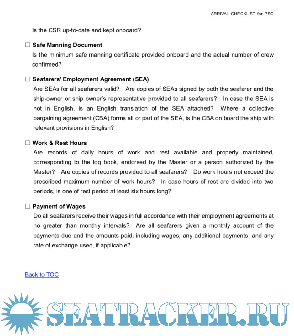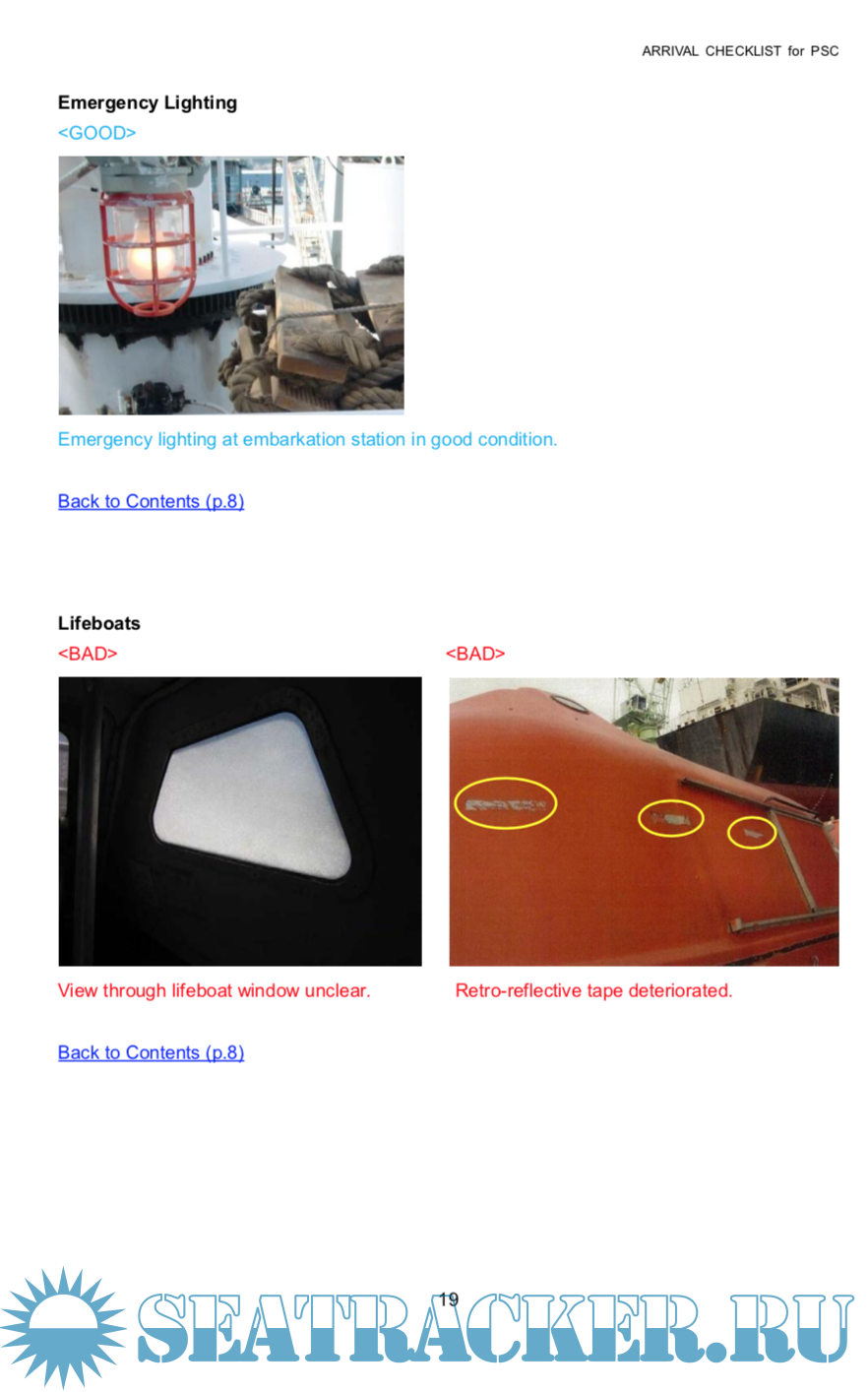 If any of the items identified in this checklist are not in good working condition, the crew should take appropriate steps to rectify the deficiencies noted prior to arrival into port. The checklist is organized according to distinct areas onboard ship for easy reference.