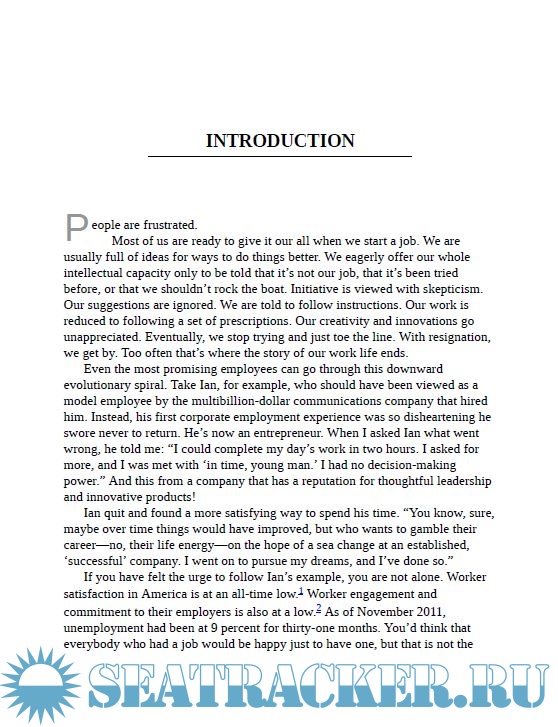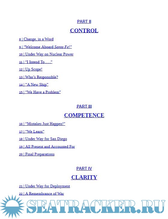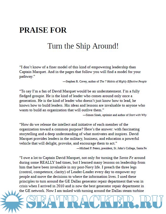 Year: 2012 Language: english Author: L. David Marquet Publisher: Penguin Group ISBN: 978-1- 10162369-5 Format: PDF Quality: eBook Pages count: 230 Description: This is a great story, one of self-discovery, tension, and the lonely self-doubts of the leader who sets off on an unknown path. We know now that Captain Marquet’s experiment on the Santa Fe was wildly successful, but at the time, neither he nor the courageous crew who embraced this new way of running an organization knew if it would work. Second, the book provides the specific mechanisms they used on the Santa Fe to achieve the transformation. We learn what they did, how the crew reacted —good or bad—and how the mechanisms matured with time. The good news is that these mechanisms are about how we interact as people, and are universally applicable. You can apply them in your organization—business, school, government, and family. Third, the book presents a comprehensive paradigm shift for how we think about leadership. Captain Marquet has coined the phrase “leader-leader” to differentiate it from the leader-follower approach that traditional leadership models have espoused. I think that laying out this distinction in such opposing terms is a good idea. Having personally witnessed how the Santa Fe operated, I can attest that this new way is not a nuanced modification of how we are doing business now; it is fundamentally different, and that is where its power lies. Additional info: Dedicated to the crew of the USS Santa Fe.