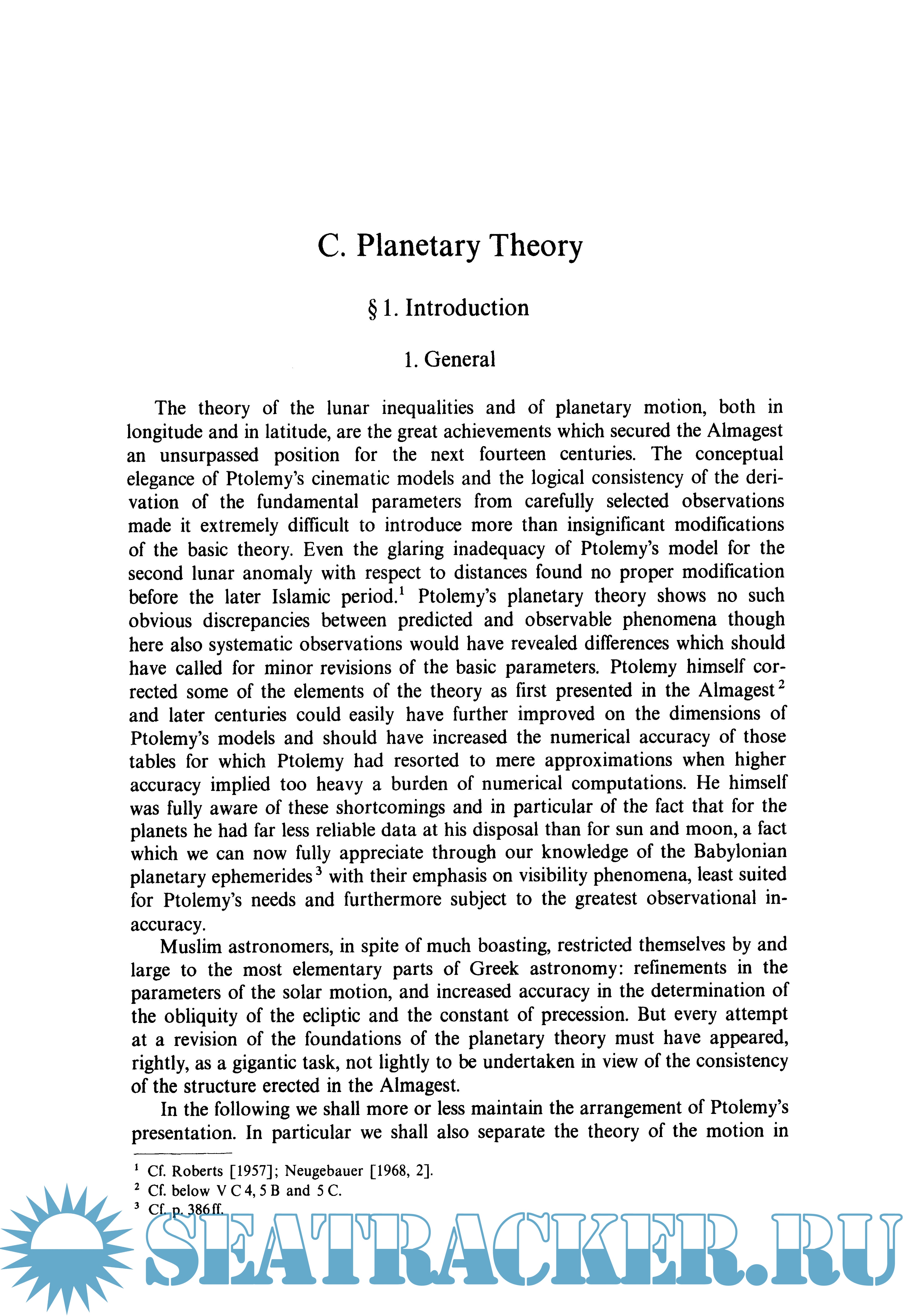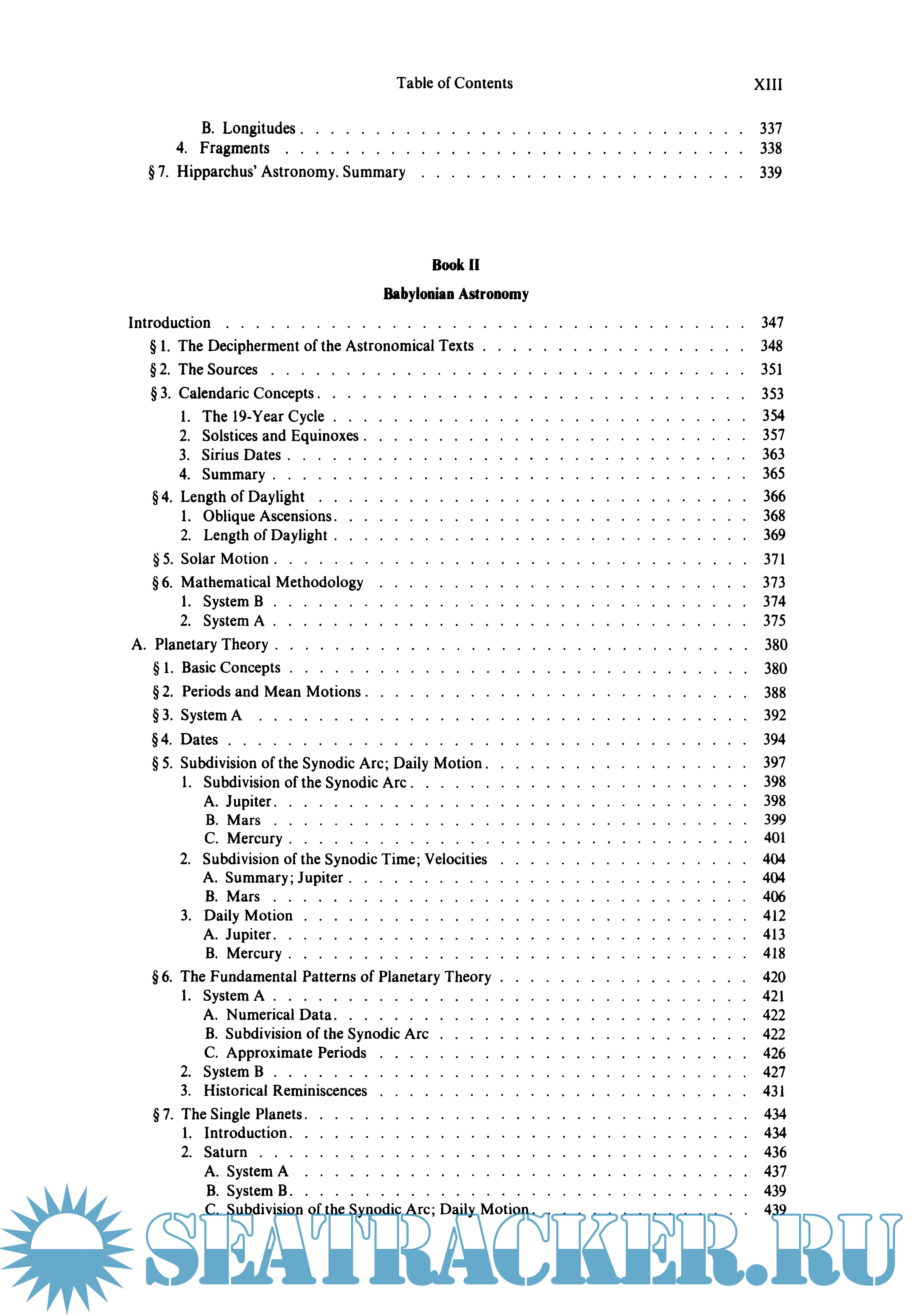 Year: 1975 Language: english Author: 0. Neugebauer Genre: Handbook Publisher: Springer ISBN: 978-3-642-61912-0 Format: PDF Quality: OCR without errors Pages count: 1468 Description: At once the most comprehensive and detailed history of ancient astronomy undertaken. From Meton of Athens in the fifth century B.C. and the unnamed scribes of Babylon, through Hipparchus and Ptolemy, to the shadowy figures of Olympiodorus and Stephanus in the early period of the Byzantine Empire, from primitive shadow tables and calendars of star phases, through Babylonian ephemerides and the Almagest, to the odd fragments preserved in late astrologers, the entire panorama of astronomy is set forth.