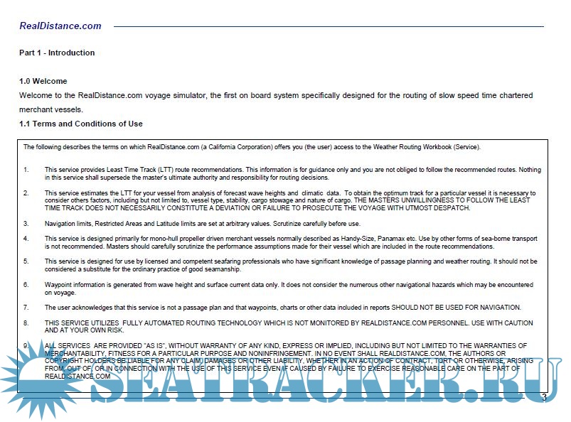 Description: RealDistance.com voyage simulator, the first on board system specifically designed for the routing of slow speed time chartered merchant vessels.