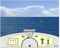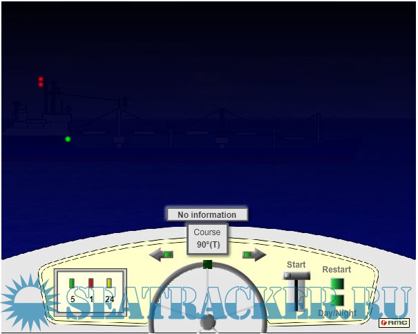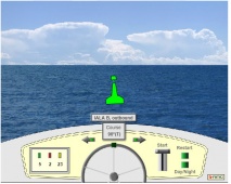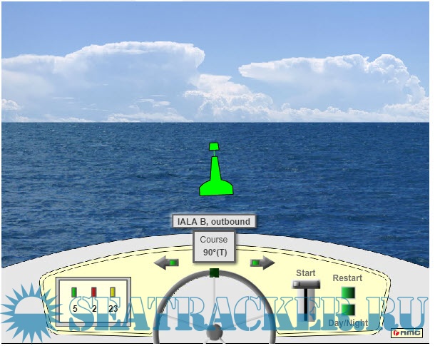 Описание: Вы находитесь за штурвалом моторного судна длиной до 20 метров и можете изменять курс вправо или влево с помощью стрелок. Запуск теста-тренажера осуществляется кликом мышки по рукоятке управления газом. Для переключения с дневного режима на ночной в любое время можно кликнуть по кнопке "Day/Night". Для перезапуска теста кликните "Restart" и после этого снова "Start" - по рукоятке газа.-You are at the helm of a motor boat up to 20 meters in length and can change course to the right or left using the arrows. The simulator test is started by clicking on the throttle control knob. To switch from day to night mode, you can click on the button at any time