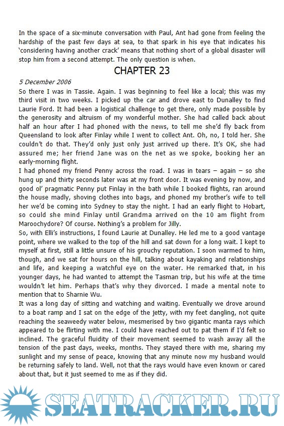 Year: 2010 Language: english Author: McAuley A. @ V. Genre: History Publisher: Pan Macmillan Australia ISBN: 1405040130 Format: PDF Quality: Scanned pages Pages count: 232 Description: On January 11th 2007, Andrew McCauley set off from Tasmania in a sea Kayak, aiming to be the first person to paddle the 1600 kms to New Zealand. A month later, NZ authorities received a garbled distress call from him. His Kayak was spotted drifting just 80 kms from NZ. His wife writes his adventure story.