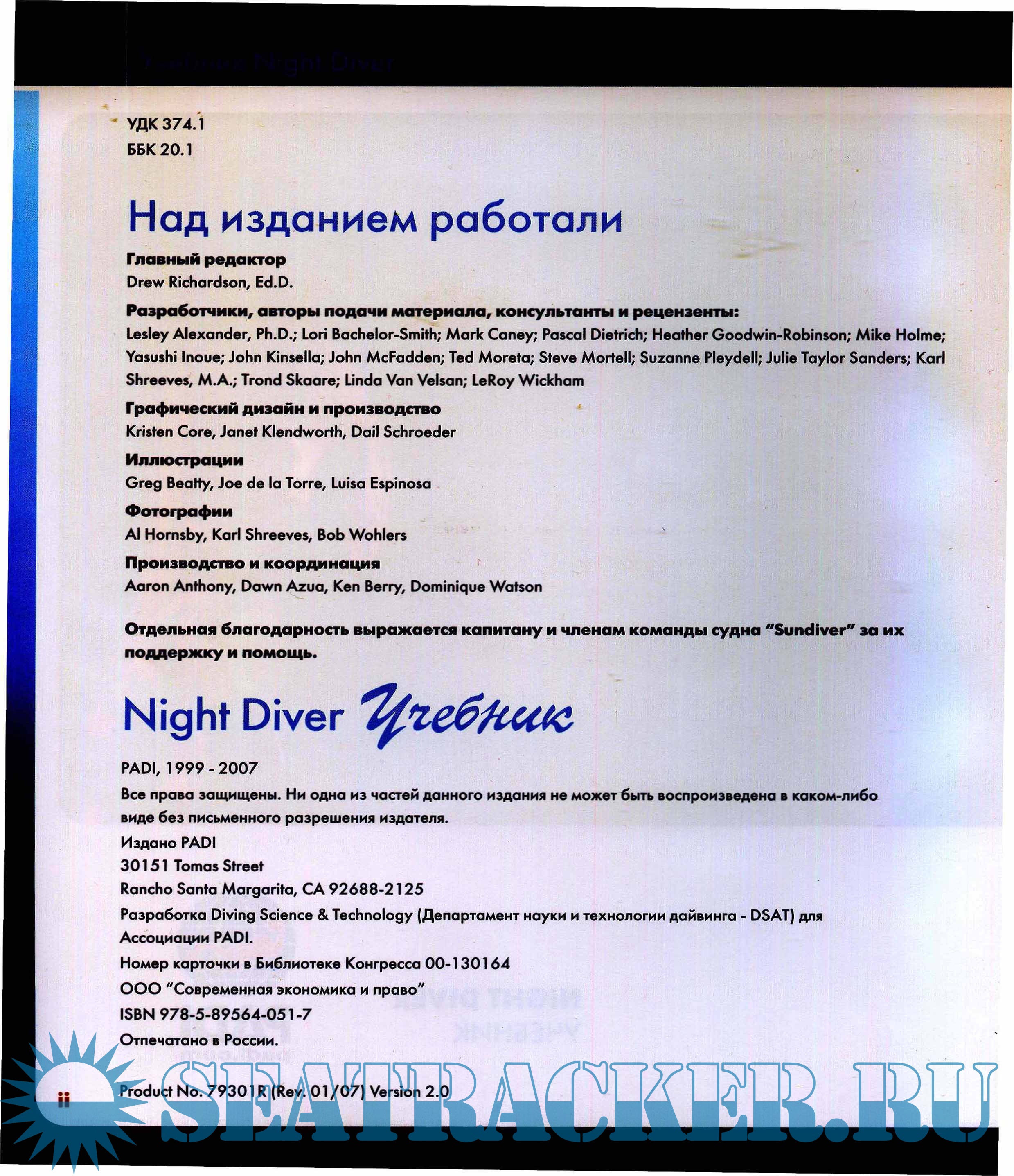 Дайвинг - это вид занятий, сопряженный с риском. Каждый дайвер в отдельности, принимающий участие в любом виде погружений, обязан согласиться с рисками и принять на себя ответственность за свои действия. Автор и издатель (и уж тем более раздающий) не несут никакой ответственности ни перед кем за утери, повреждения, травмы или смерть, вызванные любыми ошибками, пропусками в тексте, а также личной интерпретацией текста дайвером. Любая подобная ответственность не признается. Информация в данном пособии относится к дайвинrу с аквалангом и должна использоваться только как дополнение к утвержденному курсу обучения, который проводит сертифицированный инструктор.