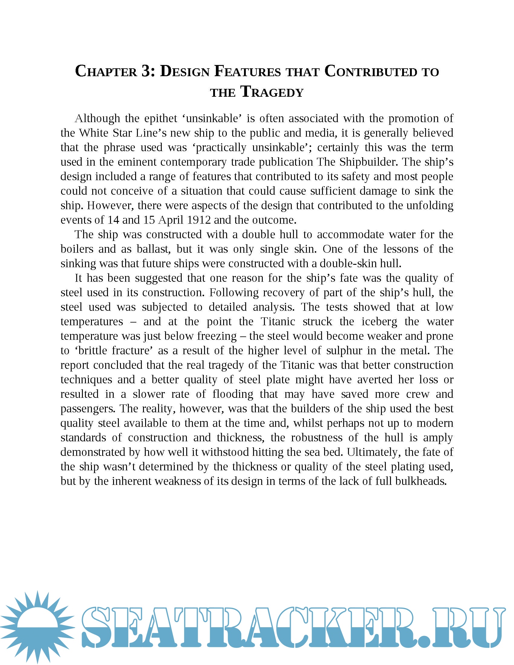 Year: 2011 Language: english Author: Sue Todd Genre: Handbook Publisher: G2 Entertainment Ltd. ISBN: 978-1-907803-00-0 Format: PDF Quality: eBook Pages count: 107 Description: RMS Titanic was the largest passenger steamship in the world when she set off on her maiden voyage from Southampton on 10 April 1912. Four days into the trip she struck an iceberg and sank, resulting in the deaths of 1,517 people in one of the deadliest peacetime maritime disasters in history. The world’s most famous passenger liner set sail for New York with 2,223 people on board; the high casualty rate was due partly to the fact that she carried lifeboats for only 1,178 people. Titanic was designed by some of the world’s most experienced engineers and used some of the most advanced technologies available. It was a great shock to many that her maiden voyage ended in such tragedy. This 100th anniversary book charts her fateful journey and describes the media frenzy about her famous victims; the legends surrounding the sinking; the resulting changes to maritime law; and the discovery of the wreck that have contributed to the long-held fascination in the ocean liner.