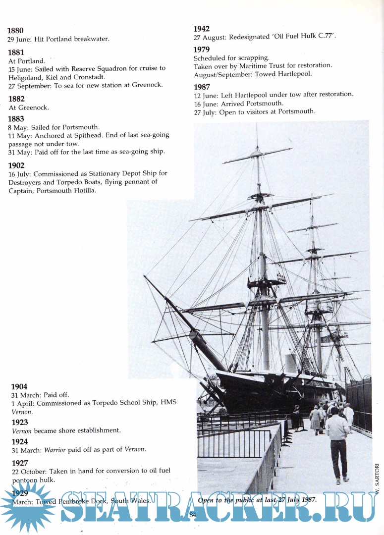 She subsequently served as a storeship and depot ship, and in 1904 was assigned to the Royal Navy's torpedo training school. The ship was converted into an oil jetty in 1927 and remained in that role until 1979, at which point she was donated by the Navy to the Maritime Trust for restoration. The restoration process took eight years, during which many of her features and fittings were either restored or recreated. When this was finished she returned to Portsmouth as a museum ship. Listed as part of the National Historic Fleet, Warrior has been based in Portsmouth since 1987.
