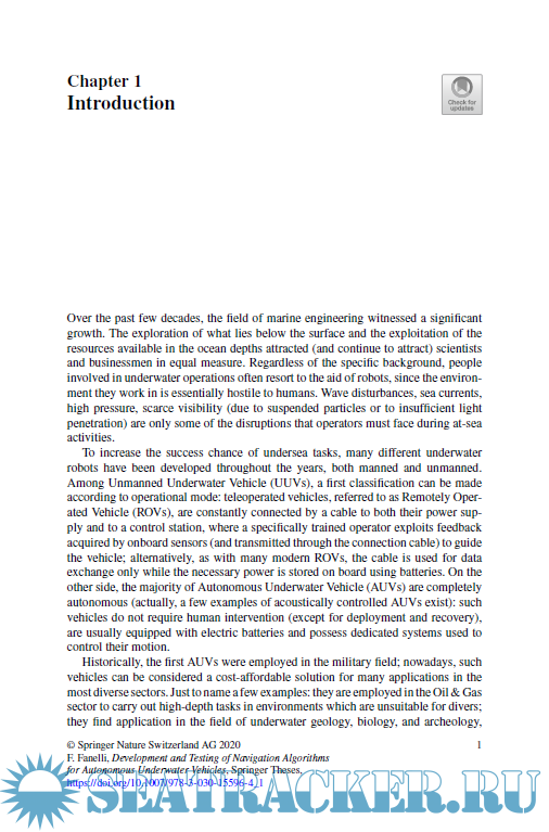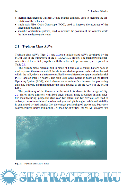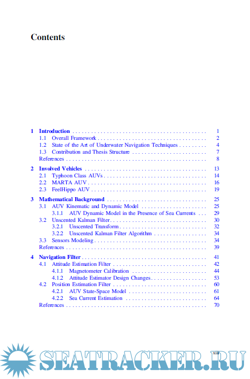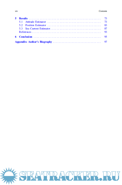 Year: 2020 Language: english Author: Francesco Fanelli Genre: Technical book Publisher: Springer International Publishing Edition: 1st ISBN: 978-3-030-15595-7;978-3-030-15596-4 Format: PDF Quality: eBook Pages count: 108 Description: This book focuses on pose estimation algorithms for Autonomous Underwater Vehicles (AUVs). After introducing readers to the state of the art, it describes a joint endeavor involving attitude and position estimation, and details the development of a nonlinear attitude observer that employs inertial and magnetic field data and is suitable for underwater use. In turn, it shows how the estimated attitude constitutes an essential type of input for UKF-based position estimators that combine position, depth, and velocity measurements. The book discusses the possibility of including real-time estimates of sea currents in the developed estimators, and highlights simulations that combine real-world navigation data and experimental test campaigns to evaluate the performance of the resulting solutions. In addition to proposing novel algorithms for estimating the attitudes and positions of AUVs using low-cost sensors and taking into account magnetic disturbances and ocean currents, the book provides readers with extensive information and a source of inspiration for the further development and testing of navigation algorithms for AUVs.
