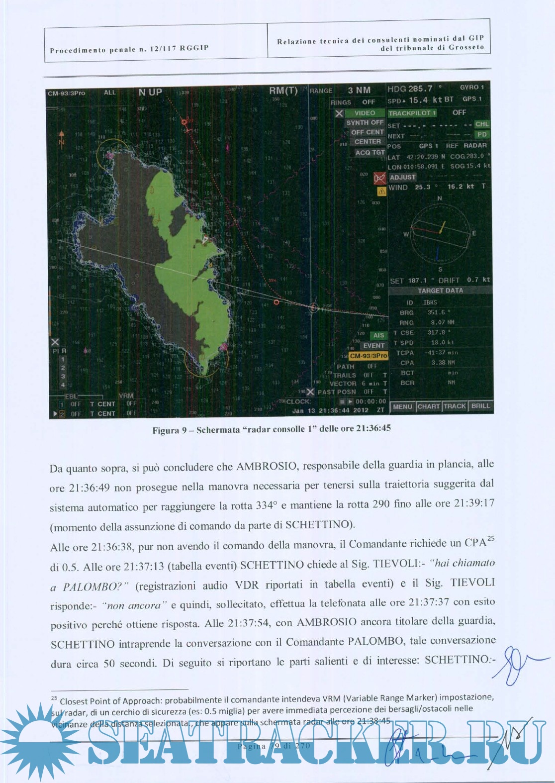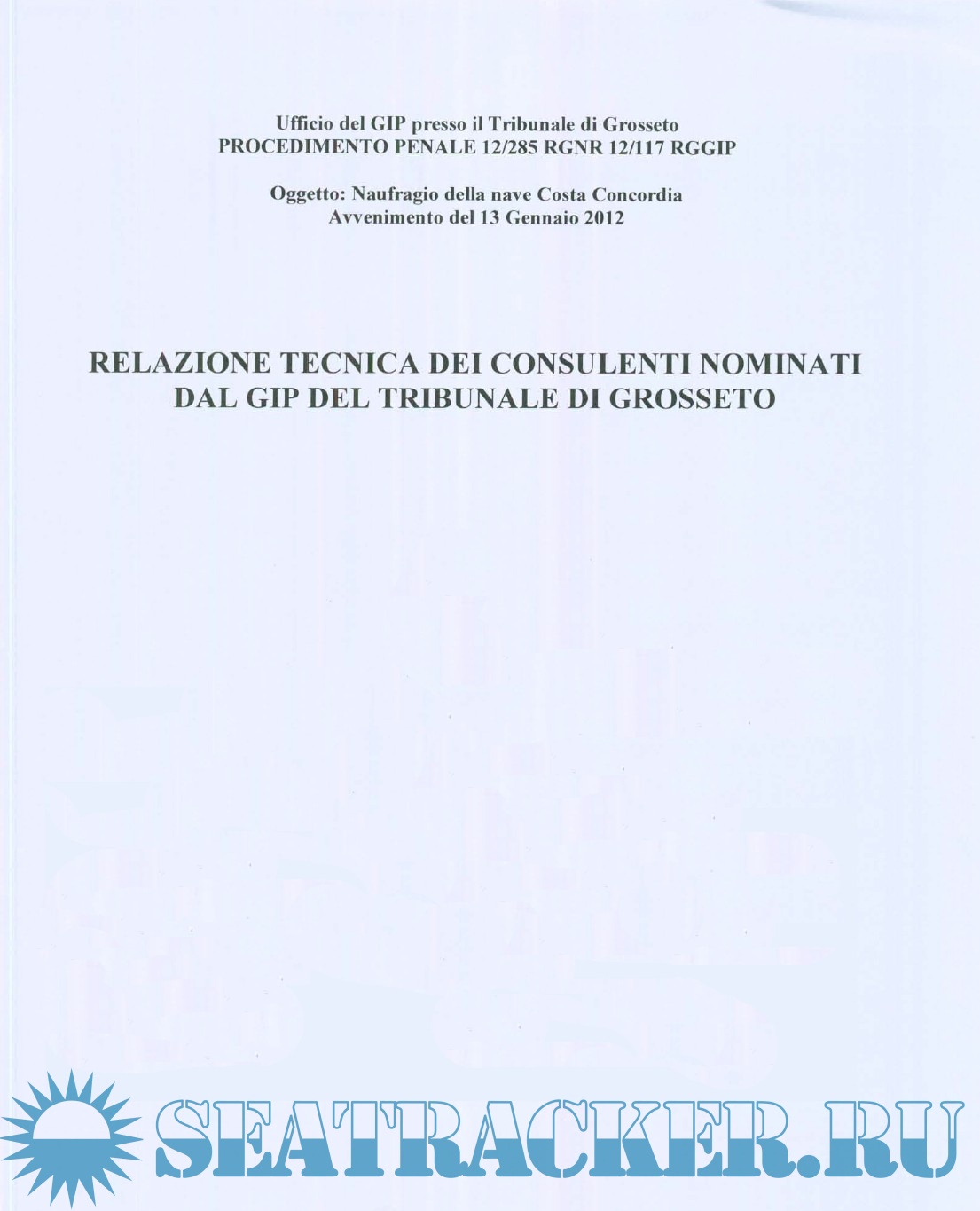 Description: Questo documento è la relazione tecnica del collegio dei periti nominati dal GIP del tribunale di Grosseto, relativo al sinistro della nave Costa Concordia. Il collegio peritale era costituito da due ammiragli (CP e Marina Militare) e da due ingegneri, docenti universitari , esperti di radar, comunicazioni e costruzioni navali. E' un'indagine estremamente approfondita sulle cause e gli errori che portarono al disastro della Costa Concordia, corredata da una vasto numero di allegati, annessi e documenti.