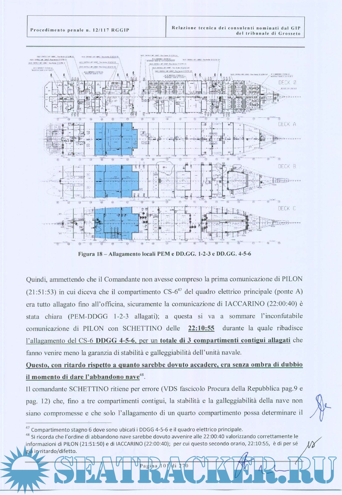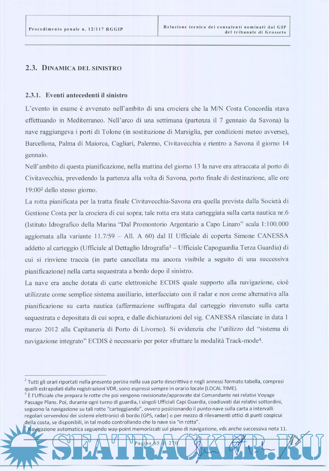 Year: 2012 Language: italian Author: Court's board of experts Genre: Documentation Publisher: n/a Format: PDF Quality: Scanned pages Pages count: 270 Description: Questo documento è la relazione tecnica del collegio dei periti nominati dal GIP del tribunale di Grosseto, relativo al sinistro della nave Costa Concordia. Il collegio peritale era costituito da due ammiragli (CP e Marina Militare) e da due ingegneri, docenti universitari , esperti di radar, comunicazioni e costruzioni navali. E' un'indagine estremamente approfondita sulle cause e gli errori che portarono al disastro della Costa Concordia, corredata da una vasto numero di allegati, annessi e documenti. This document is the technical report of the board of experts designated by the Court of Grosseto (Italy), about the Costa Concordia shipwreck. Board of experts was consisting of two admirals (Coast Guard and Italian Navy) and two engineers, university professors of radar, marine communications and ship building. It is an extremely thorough investigation into the causes and errors that led to the disaster of Costa Concodia, accompanied by a vast number of attachments, annexes and documents
