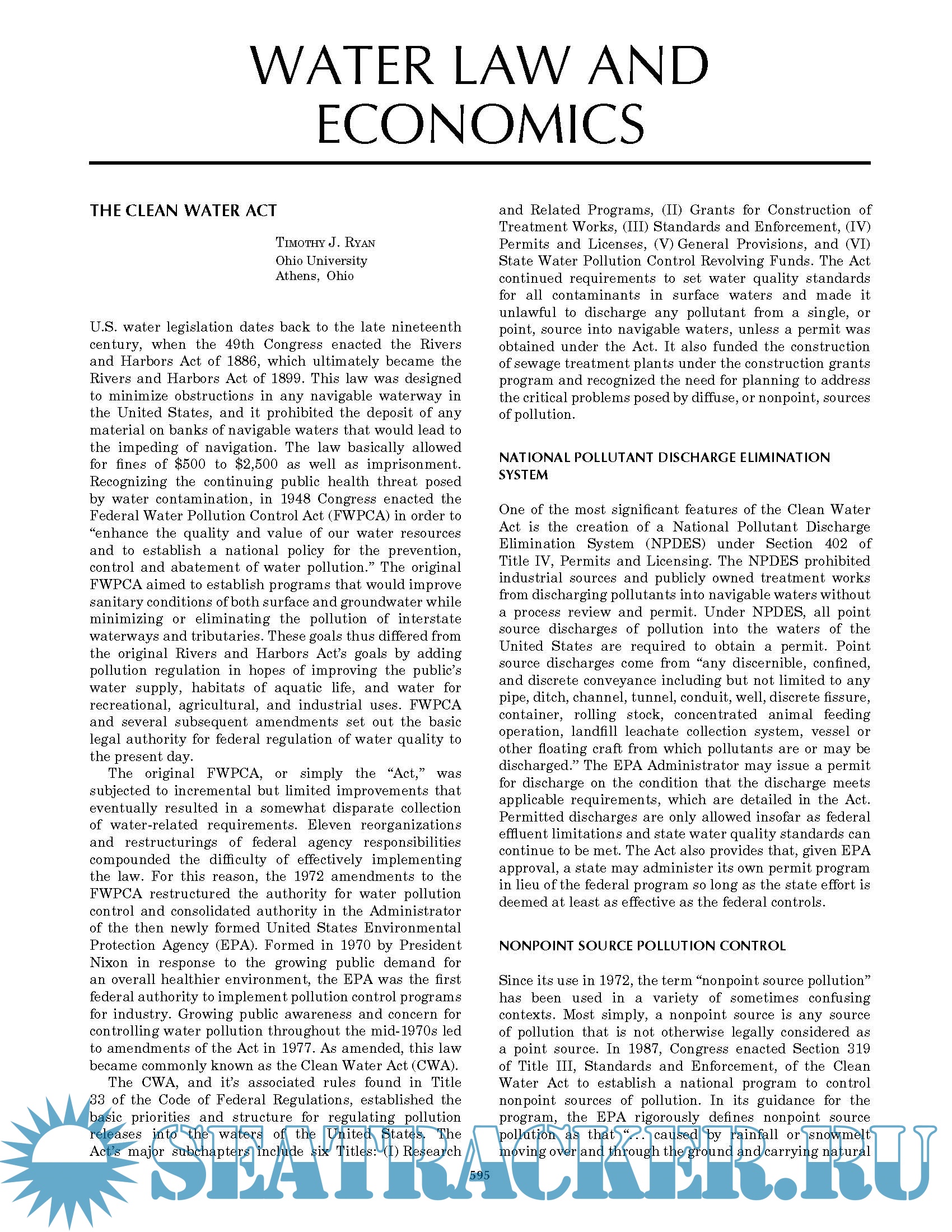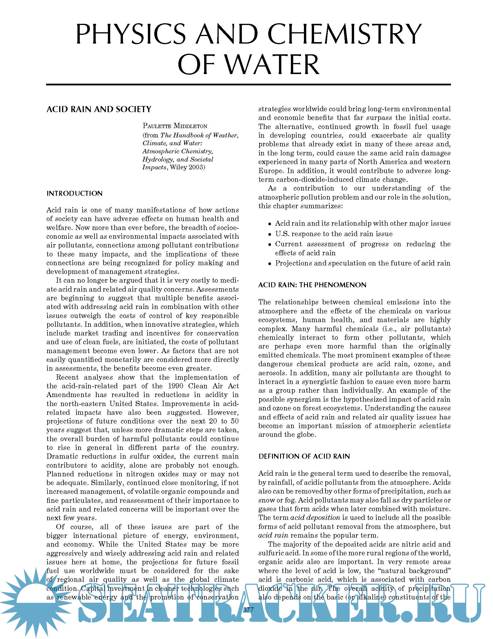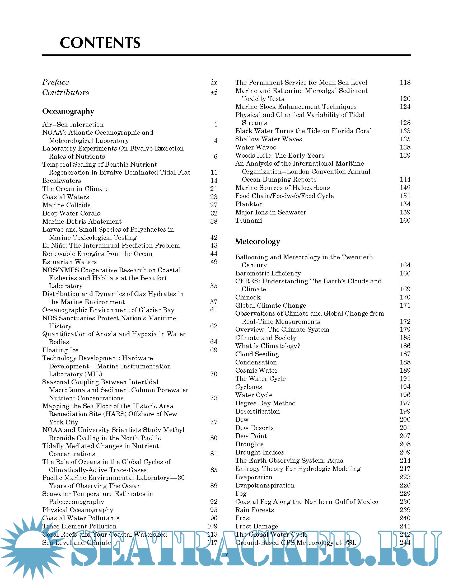 This encyclopedia has short, illustrated and referenced papers relating to water in each of the following sections: (1) Oceanography (47 papers); (2) Meteorology (71 papers); (3) Physics and chemistry of water (67 papers); (4) Water law and economics (26 papers); and (5) Water history, art, and Culture (33 papers).