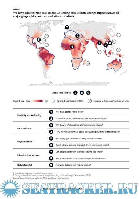 Physical hazards and socioeconomic impacts. In that report, we measured the impact of climate change by the extent to which it could affect human beings, human-made physical assets, and the natural world. In order to link physical climate risk to socioeconomic impact, we investigated nine specific cases that illustrated exposure to climate change extremes and proximity to physical thresholds. We explored risks today and over the next three